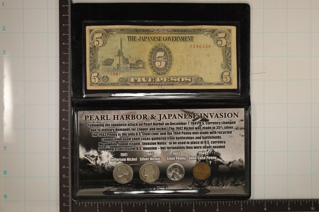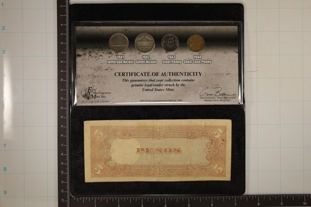 SET IN BLACK FLIP FOLIO. CONTAINS: 1941 JEFFERSON NICKEL, 1942 35% SILVER JEFFERSON WAR NICKEL, 1943 LINCOLN STEEL WAR CENT AND 1944 SHELL CASE PENNY PLUS JAPANESE GOVERNMENT 5 PESO BILL.