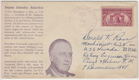 A group of five postal covers: two covers canceled aboard the U.S.S. Nevada, postmarked Nov. 11, 1932 and Dec. 7, 1941 respectively, signed by DONALD K. ROSS, the first to receive the Congressional Medal of Honor, with each bearing the details of his service. Together with three postally-used covers: the first canceled aboard the U.S.S. George F. Elliott, Jan. 1941, the second canceled aboard the U.S.S. Whippoorwill, canceled Feb. 4, 1933, and the third aboard the U.S.S. Utah, May 30, 1936; with a vintage real photo postcard showing a captured Japanese sub. Very good condition.