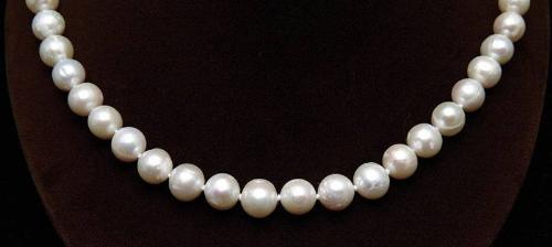 PEARL NECKLACE. 18" pearl necklace is made up of 9 - 9-1/2mm cultured pearls and terminates in a 14kt yellow gold clasp. CONDITION: Luster on pearls has some unevenness, otherwise good. 5-61914