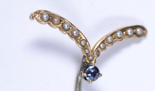 This is antique and shows some wear. One pearl is cracked but secure in mounting. It looks as though the pin has been replaced or re soldered at one time. Very pretty and delicate piece. Est value: $150-200