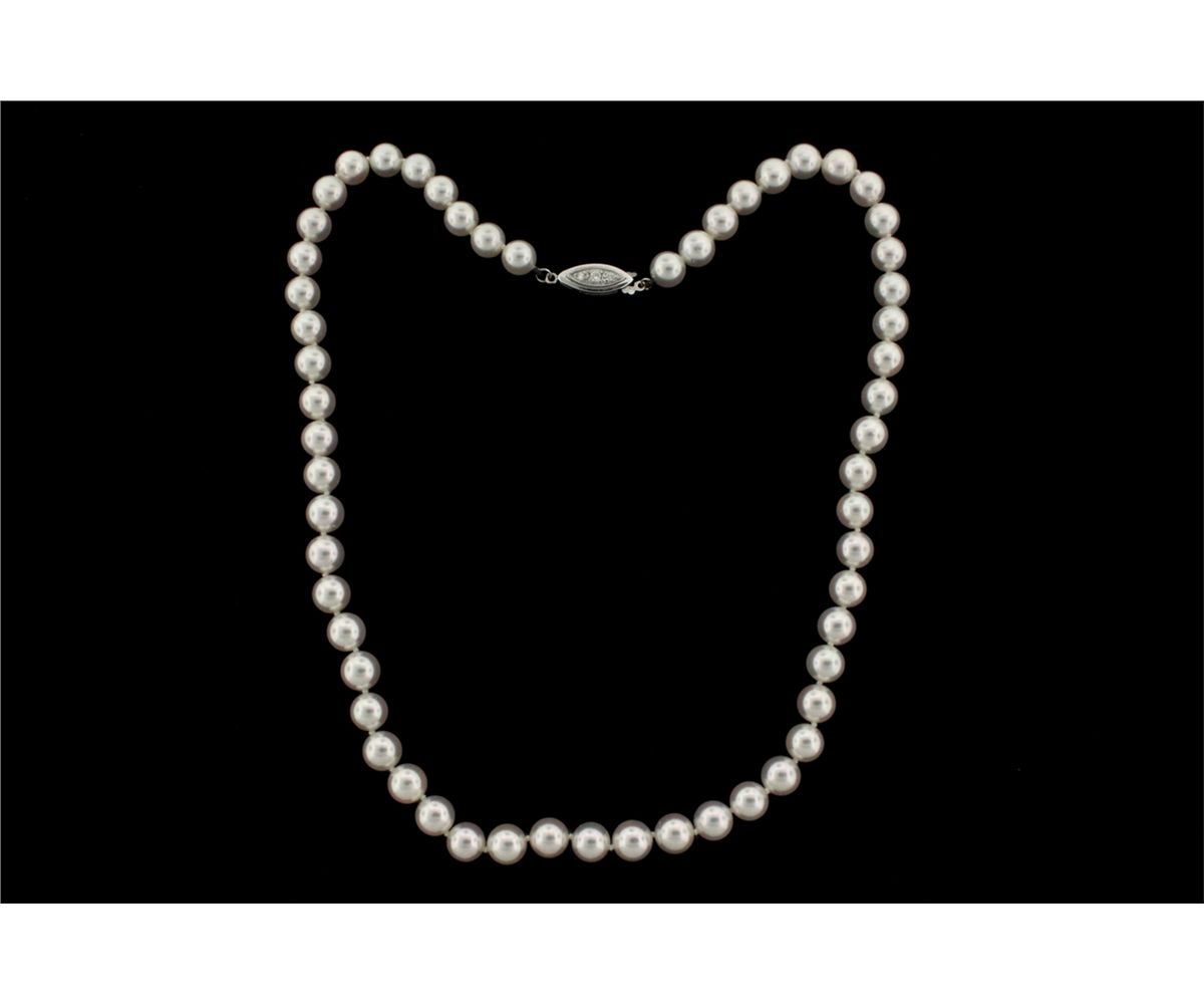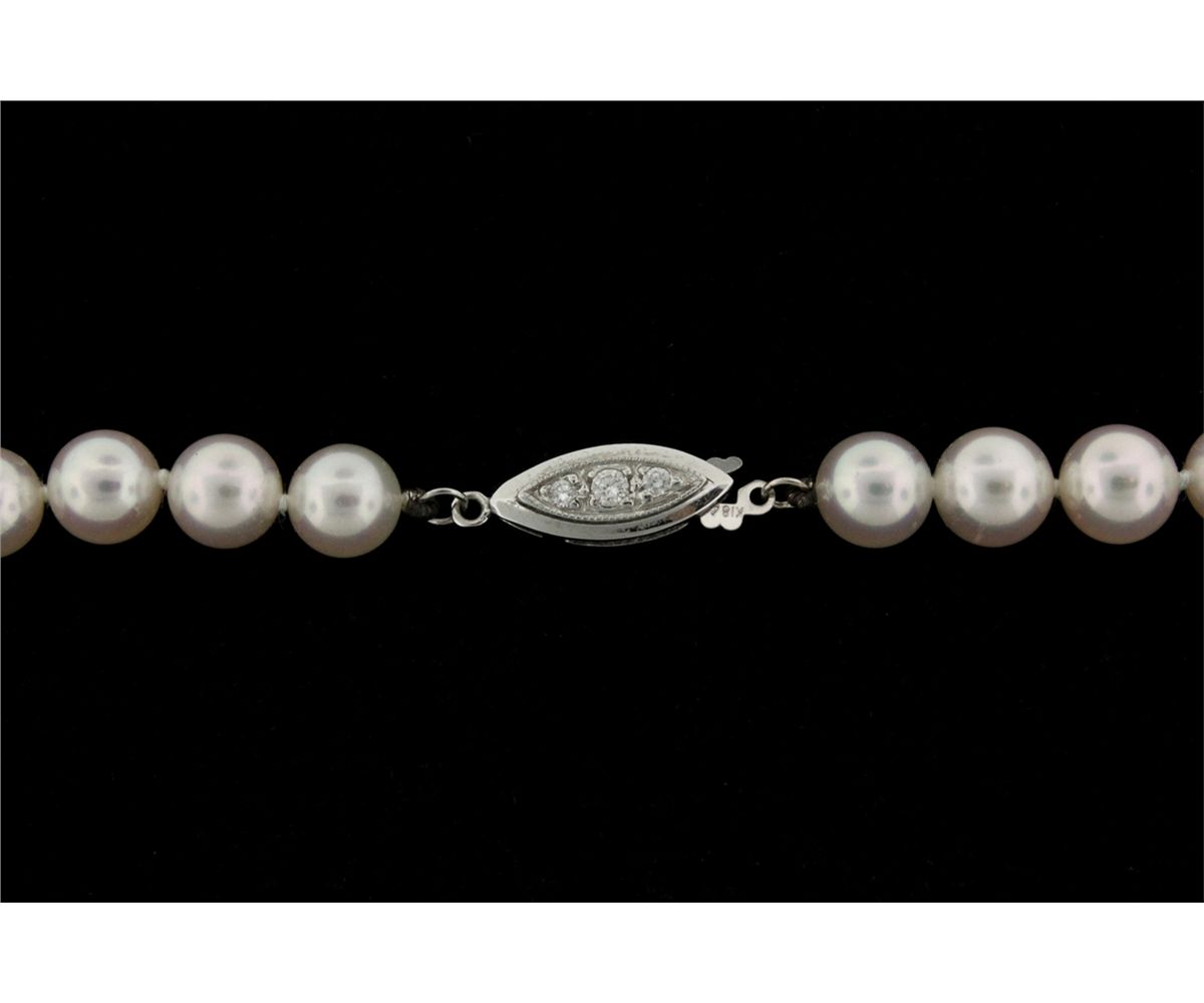 PEARLS: [1] Single strand of 7.0 - 7.5mm fine quality Akoya pearls with an 18KWG fishhook clasp set with 3 rd diamonds, approx. 0.09 cttw., good / G / VS; 18"s