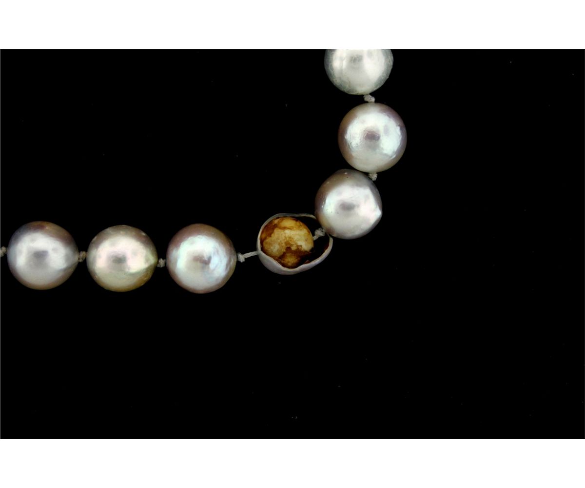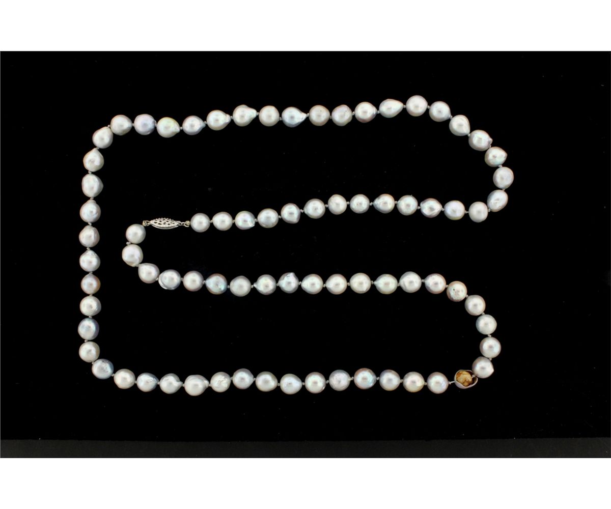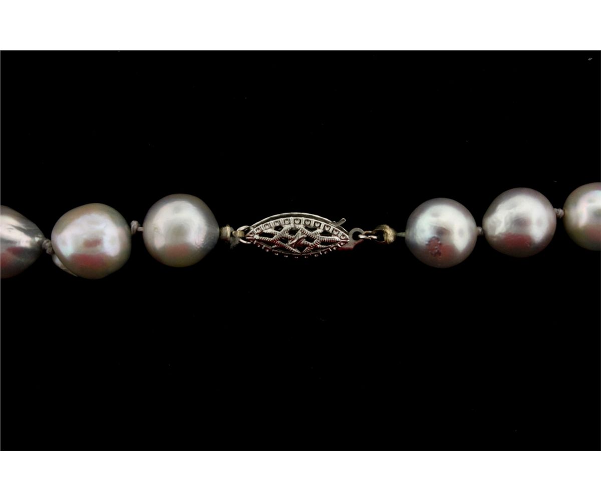 PEARLS: [1] Single strand of 9mm silvery light gray baroque pearls with a 14KWG fishhook clasp; 34''s; 1 pearl is broken.