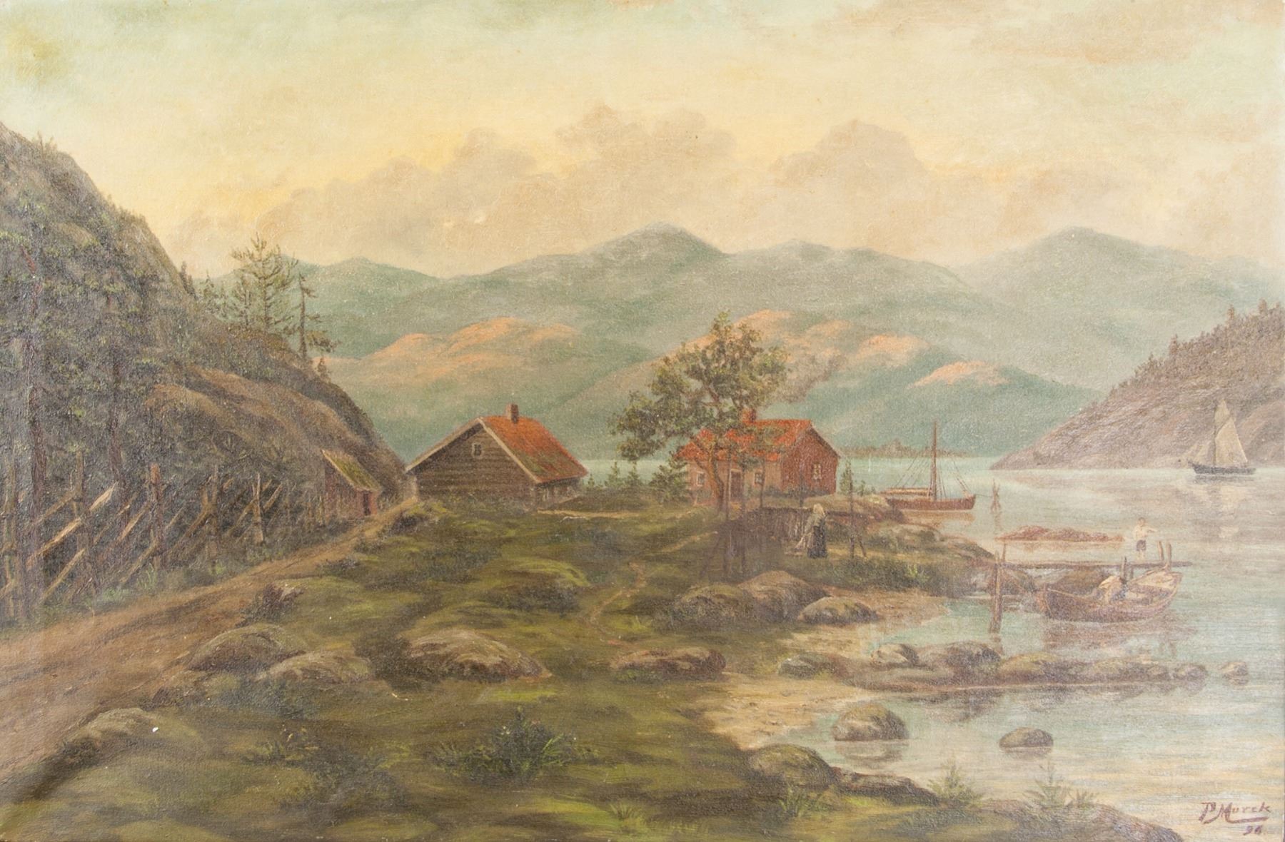 Mountainous landscape and harbor scene; oil on stretched canvas. Signed and attr. Peder Mork Monsted (Danish, 1859-1941) and dated 1896. 23 x 34.5 in. (58.4 x 87.6 cm). Peder Monsted was a Danish realist painter. Best known for his detailed landscapes, his work often features scenes of dense forest and rural Danish life rendered with a high level of precision, creating a romantic and poetic view of nature. Mønsted quickly became known for his ability to depict the grandeur and monumental aspect of the landscape, with an eye for accurate detail and color. His comprehensive studies of different artistic techniques enabled him to mix academic naturalism with an almost Photorealistic approach to familiar subjects. Born on December 10, 1859 in Balle Mølle, Denmark, Mønsted enrolled at the Academy of Copenhagen, where studied under prominent Danish genre painters such as Johann Julius Exner and Andreas Fritz from 1875 to 1879. Mønsted enjoyed a long and prolific career, traveling to places like North Africa and the Middle East, and regularly exhibited his work in Paris and Munich salons. Today, his work can be found in institutions such as the Chi-Mei Museum in Taiwan and the Dahesh Museum in New York. The artist died in Fredensborg, Denmark on June 20, 1941. PROVENANCE: Upper New York Estate