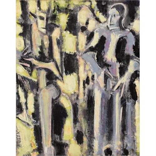 <B>Pedro Gasto </B></I>(Spanish 1908-1997)<B><BR></B></I><I>Saint Miguel and The Devil<BR></B></I>Oil on canvas<BR>36 x 25-1/2 inches (91.4 x 64.8 cm)<BR> Pedro Gasto chose the biblical theme of Saint Michael, the Archangel and his battle with the devil as the subject of this dramatic painting. While mentioned in the Old Testament, the stories of Michael's battles with the devil appear throughout the New Testament, particularly in the Book of Revelation as Michael throws the devil from heaven. It is Gasto's interpretation of that battle that he depicts here.<BR><BR>Fiery orange and deep blacks come alive in this picture of Michael on the right side of the canvas facing the devilish figures that surround him. Contorted shapes lead the viewer to make out the hellish forms--tails, masks, legs that are the abstract form of the devil according to Gasto. This is a compelling work from a Spanish artist who drew much attention for his paintings.<BR><BR><b>Shipping:</b> Requires 3rd Party Shipping (<a target="_blank" href="http://www.heritageauctions.com/common/shipping.php">view shipping information</a>)