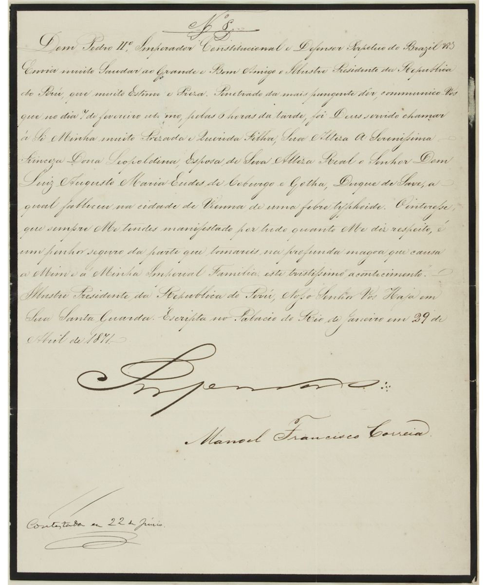 (1825 - 1891) Emperor of Brazil, the second and final Brazilian Emperor. His rule saw the beginnings of industrialization, the first paved roads, the first steam-engine railway, a submarine telegraphy cable, and the introduction of the telephone. Manuscript D.S. 1p. folio, Rio de Janiero, Apr. 29, 1871, a letter of state on black-bordered letterhead directed to the President of Peru and making an introduction. Signed at conclusion with a huge 6 1/2" signature and countersigned by Brazilian politician FRANCISCO MANUEL CORREIA (1831-1905). Mounted, light scuffing to edges, very good.