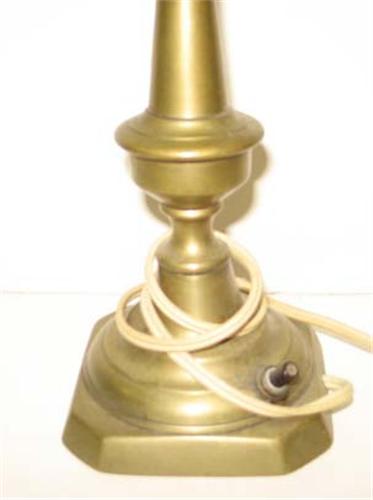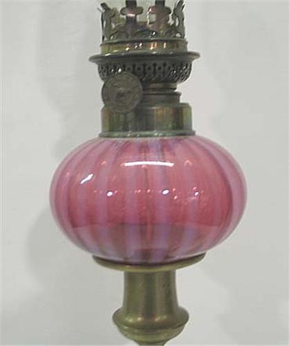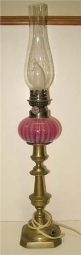 PEG LAMP WITH CRANBERRY GLASS BOWL. Electrified. Brass stem and base. 21” H to top of chimney.