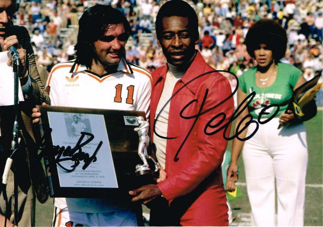 A rare small photo signed by two of the world's best Soccer stars: Pele and George Best.