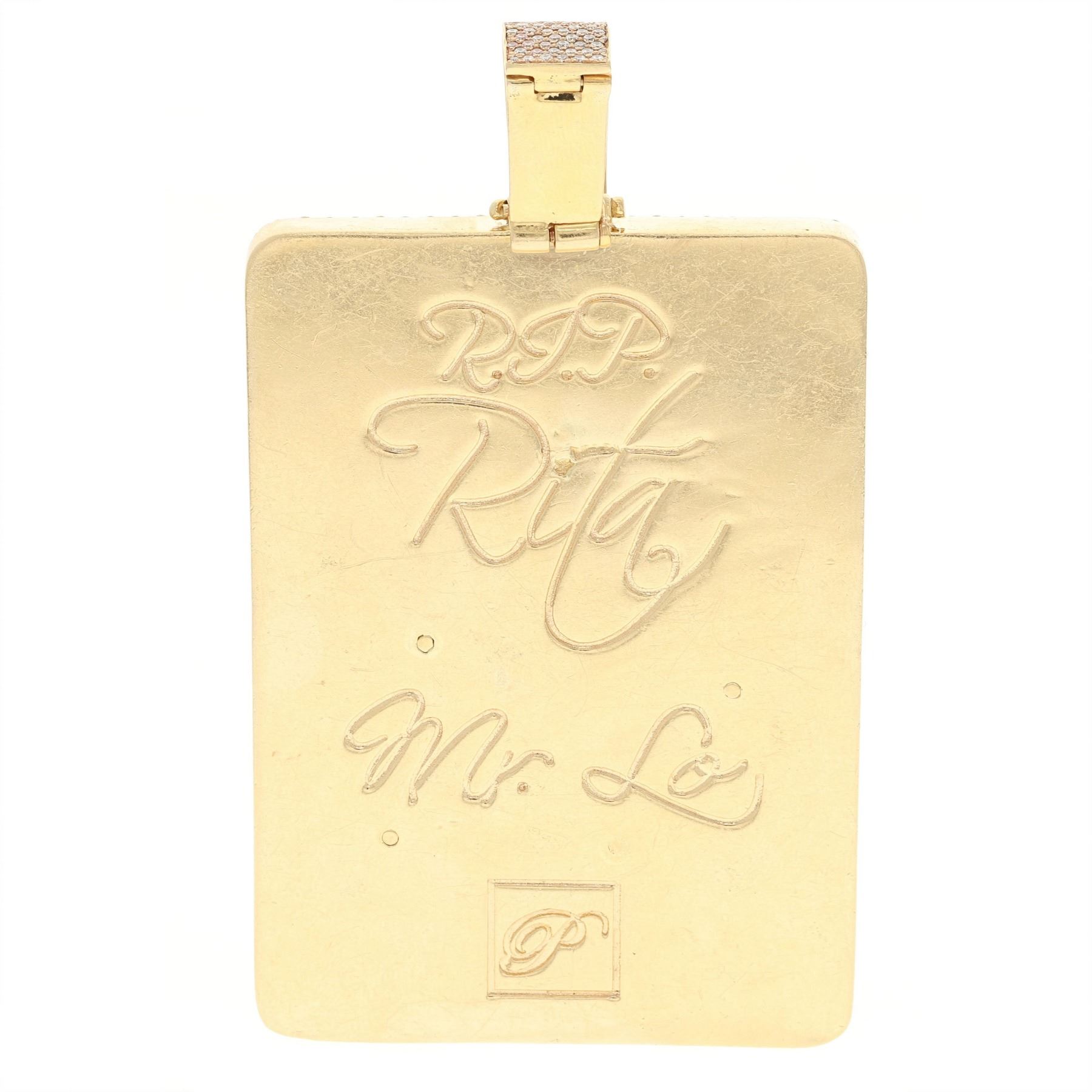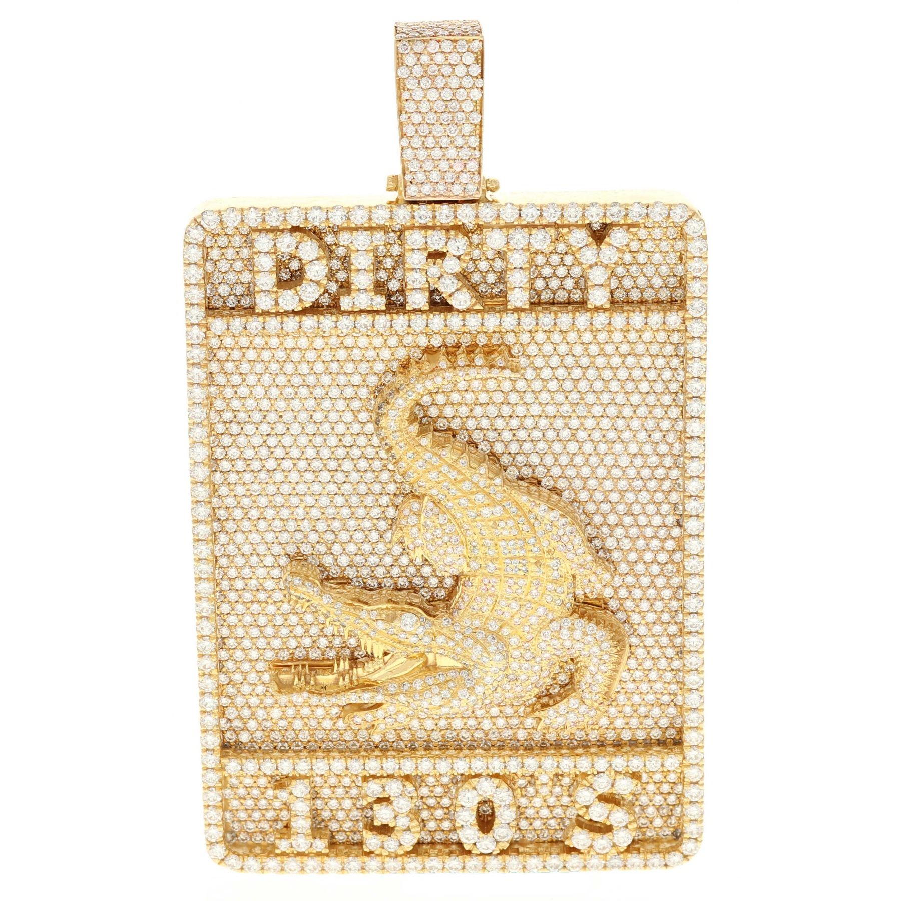 PENDANT: [1] 14 karat yellow gold 'DIRTY 130's' alligator pendant set with round diamonds, approx. 15.00 carats total weight, G-H color, VS clarity; 248.54 grams; back is engraved: RIP Rita Mr. Lo