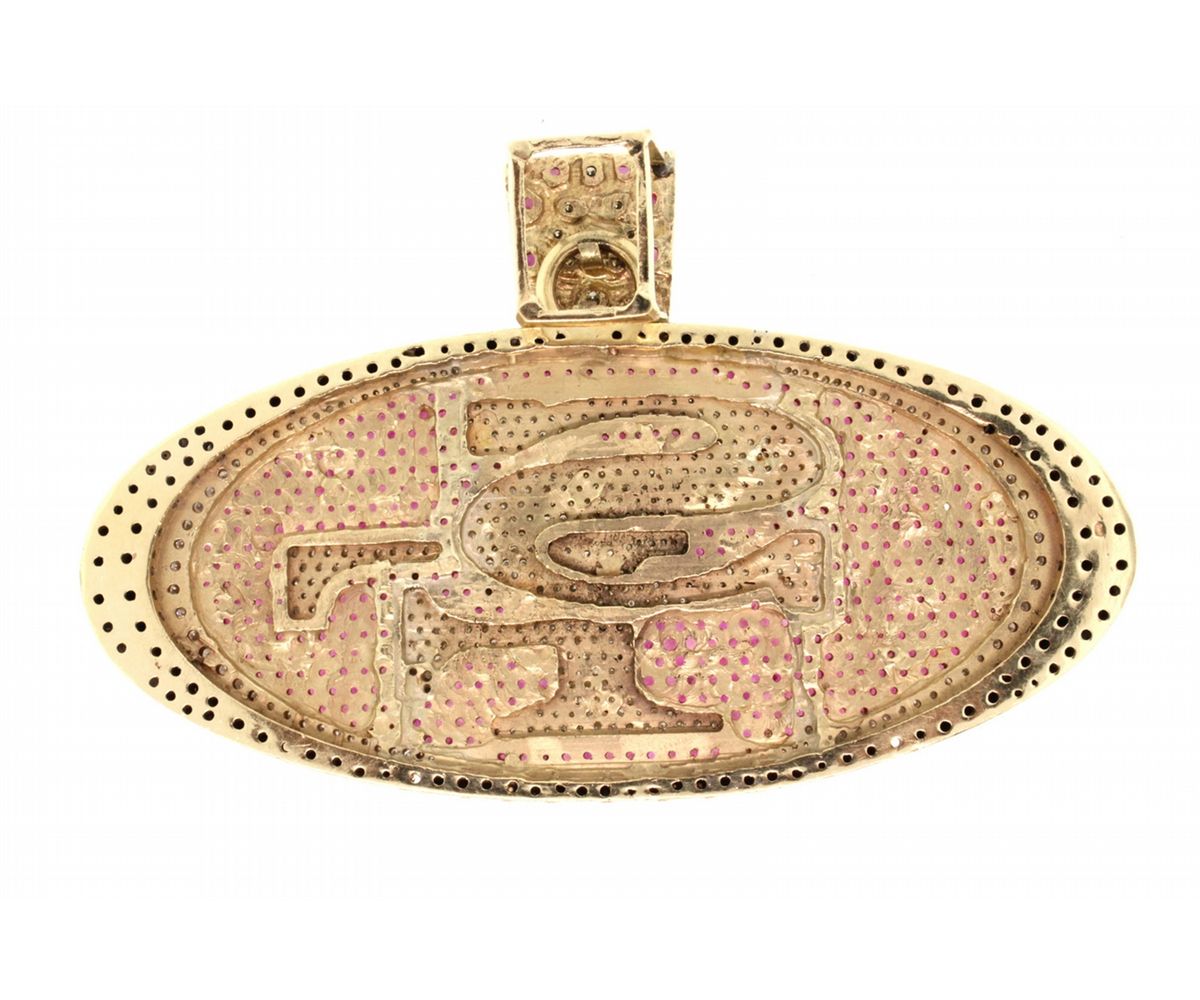 PENDANT: [1] 14KYG 'SF' pendant set with 8 marquise rubies, approx. 0.75 cttw., 537 diamonds, approx. 11.60 cttw., fair-poor/ J, TLB & black/ SI2-I3; and 379 pink sapphires; missing 4 stones; mixed in are a few synthetic clear and pink stones; 130.7 grams.
