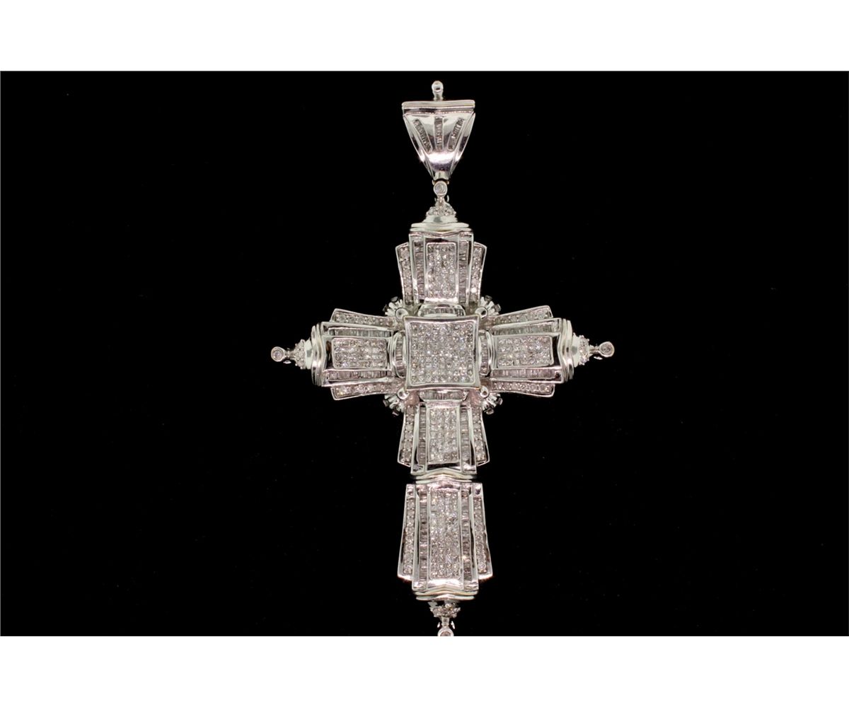 PENDANT: [1] Mens 14kw "invisible" set diamond cross pendant; 241 prin dias, 1.0mmx1.1mm to 1.1mmx1.4mm = est 2.14cttw, Fair/G-J/SI1-I1; 80 rb dias, 1.3mm-1.5mm = est 1.04cttw, Poor/H-K/I3; 153 tap bag dias, avg 1.5mm x 1.0mm-0.8mm = est 1.50cttw, Poor/H-K/I3; 3.75" tall x 2.3" wide; 37.56 grams.
