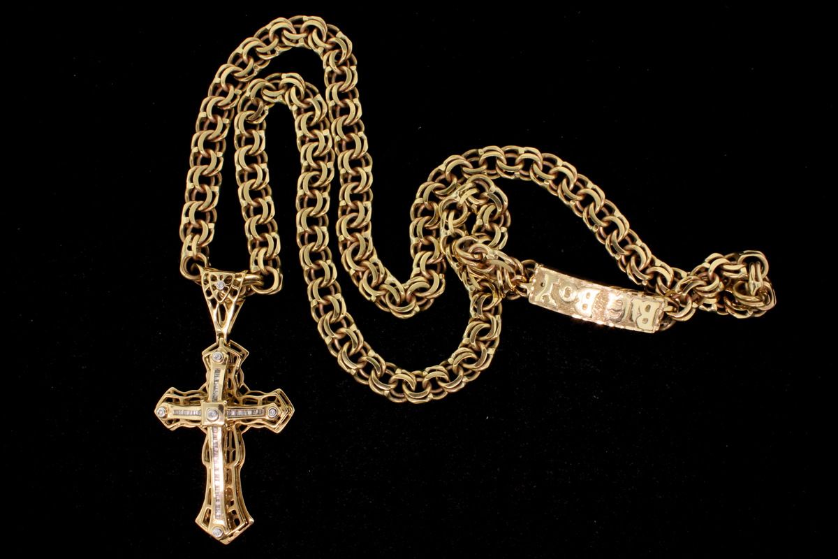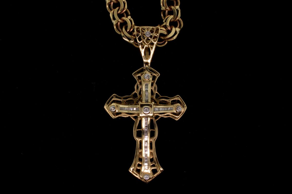 PENDANT AND CHAIN: [1] Gents diamond and 10kyg cross pendant on 10yg (tested) chain. Cross is 3'' long x 1 3/4'' wide. Set with (56) baguette diamonds and (5) rbc diamonds I1 - I2 H-I-J color, approx. 1.00cttw. Trademarked CM. The chain is 28'' long x 9.5mm wide with double curb links design. Signet style top section says ''Big Boy''. 111.1g