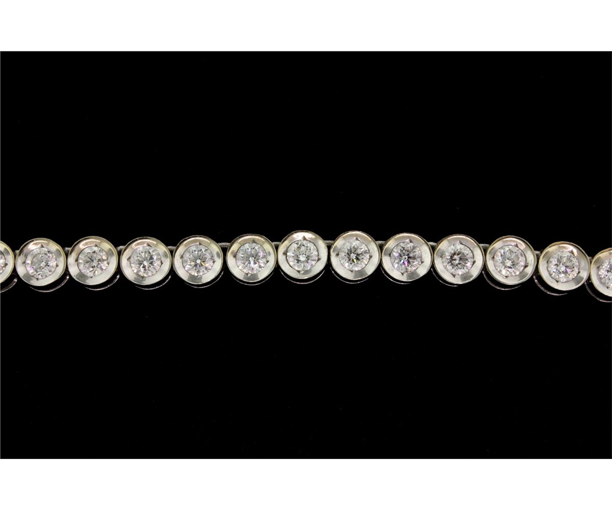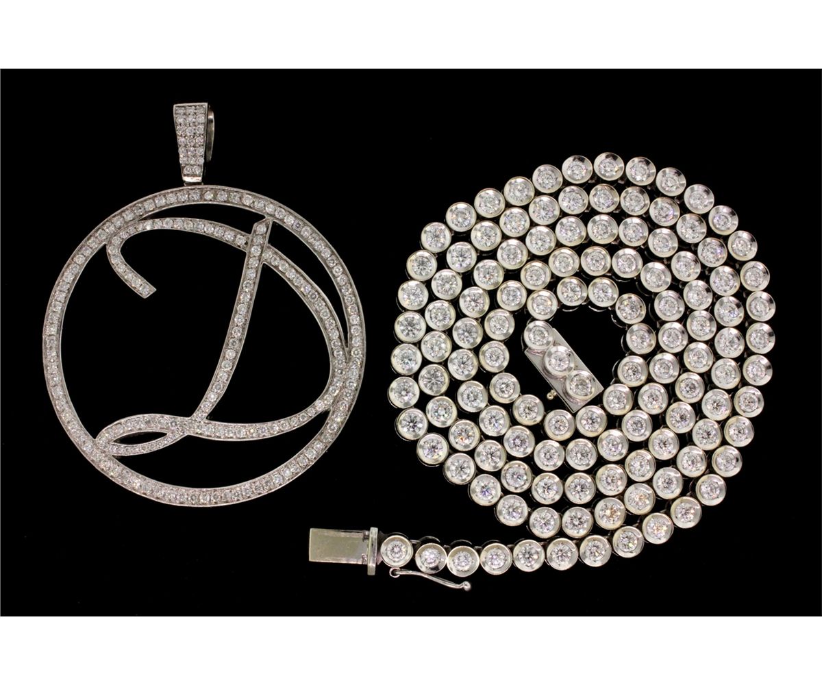 PENDANT: Men's 14kw open circle script initial "D" diamond pendant; 284 rb dias, 1.5mm to 2.1mm = est 8.22cttw, Good-V.Good/I-K/SI2-I2; 2.35" outside diameter; 72.29 grams. NECKLACE: Men's 14kw diamond line link necklace; 124 rb dias, 4.0mm - 4.2mm = est 29.76cttw, V.Good-Good/G-J/I1; 6.53mmW x 5.22mmT x 32" long; 153.93 grams.