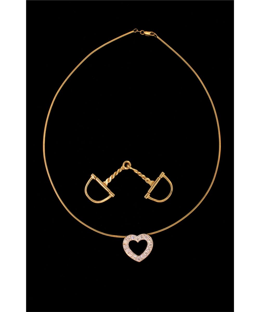 PENDANT & NECKLACE: (1) Diamond and 14ky heart slide pendant and neck wire. Pendant is 3/4" long with open center bead set with (16) rbc diamonds VS2-SI1 clarity G-H color, 1.60cttw. Choker is 16" long 1.5mm wide. Heart hallmarked TW86. 17.9gPENDANT: (1) 14ky stirrup 2 1/2" wide. Missing bail? 8.4g