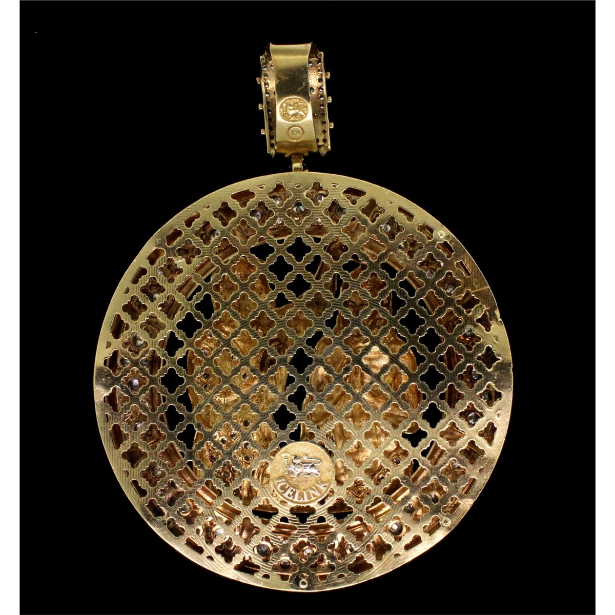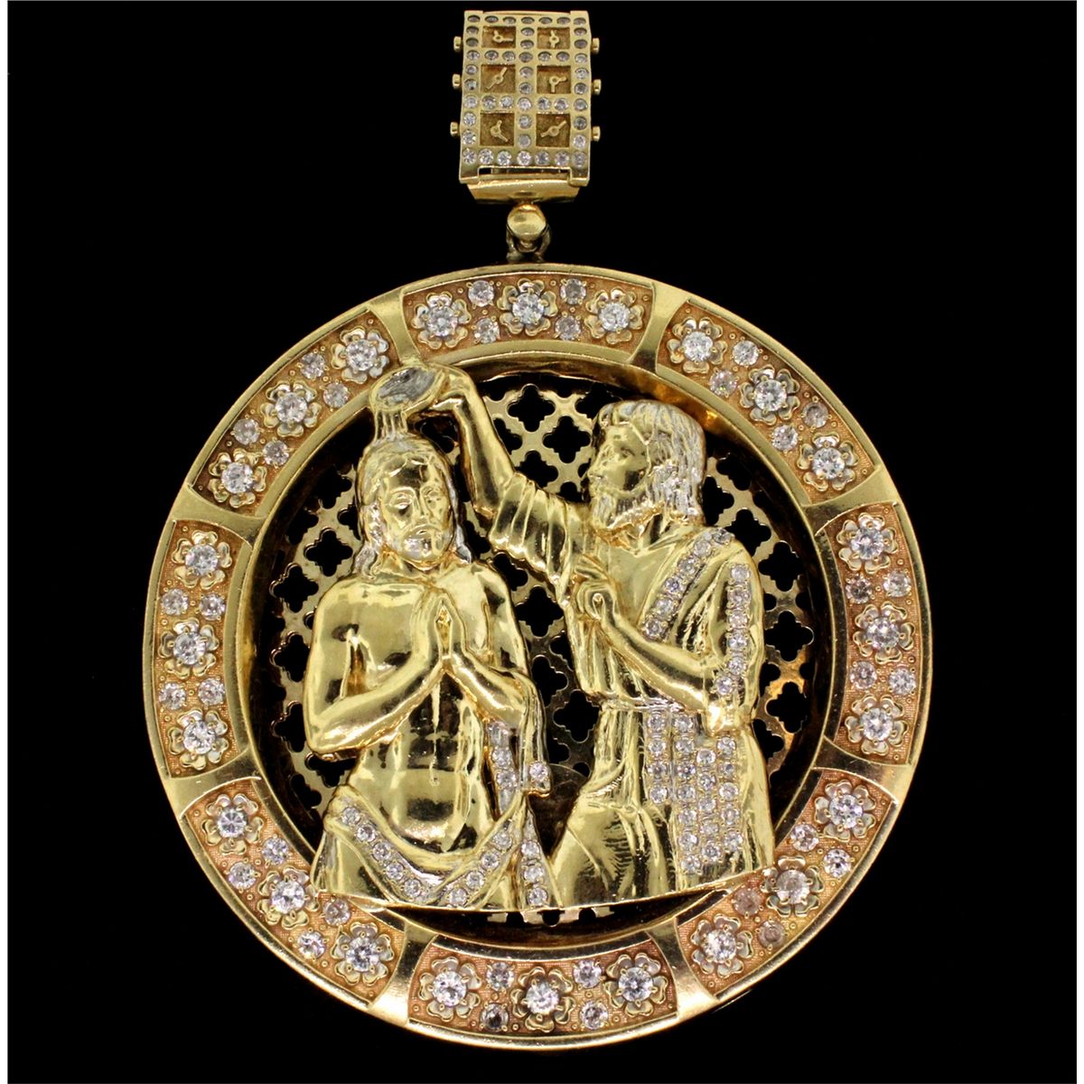 PENDANT: Unisex 10ky religious motif cubic zirconia pendant; image of John the Baptist baptizing Jesus; 149 rb cz's, 2.0mm to 4.25mm; 4.17" outside diameter (round); IceLink tdmk; 135.85 grams.