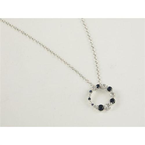 PENDANT WITH CHAIN: Geometric 14k white gold circurlar pendant with chain set with dark blue sapphires and diamond. The sapphires measure approximately 0.50 ctw and are transparent to semi transparent. The diamonds measure approximately 0.25 ctw with SI2 to I1 clarity and F to G color. Appraisal included.