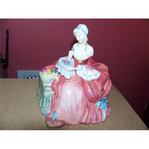 THIS IS AN EXTREMELY RARE FIGURINE OF A VICTORIAN LADY SITTING ON HER SETTEE DOING NEEDLEPOINT WITH HER BASKET OF YARN NEARBY. THERE IS A LOT OF COLOR TO THIS FIGURINE, FROM THE SWEET BLOND CURLS OF HER HAIR TO HER FULL DRESS WITH BLUE BOW ON DOWN TO HER POINTED TOE BLUE SHOE.H.N.#1901.SHE IS COPYRIGHTED 1939 AND IS IN PRISTINE CONDITION. HER DRESS IS GATHERED UP IN THE BACK. SO POIGNANT AND TASTEFUL!ARTIST INITIALS D.M.