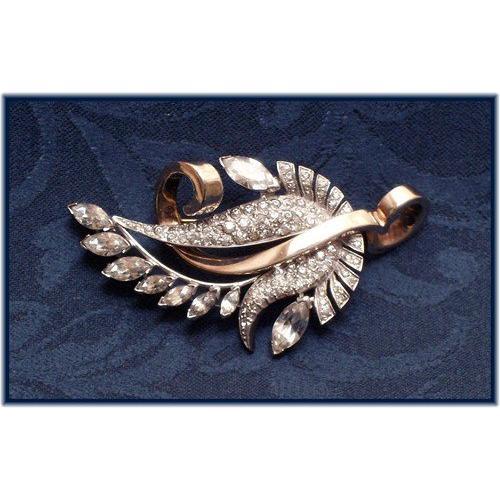 Pennino was founded in 1927 and specialized in sterling silver or gold plated high end costume jewelry through 1961. It is highly collectible due to it's rarity and fine quality materials and craftsmanship. This stunning brooch is a classic Pennino design and crafted of sterling silver and gold plated sterling, making it's weight quite substantial. Of a nature theme, the brooch is a leaf design, encrusted with pave' rhinestones. The curling vein is of gold plated sterling silver, creating a beautiful contrast with the clear rhinestones and sterling silver. Enhancing the beauty of this piece are several marquise cut rhinestones, graduating in size on the leaf border. Measuring 2 5/8 inches in length and 1 3/8 wide, it is in superb vintage condition. This is truly a stunning piece to add to one's collection.
