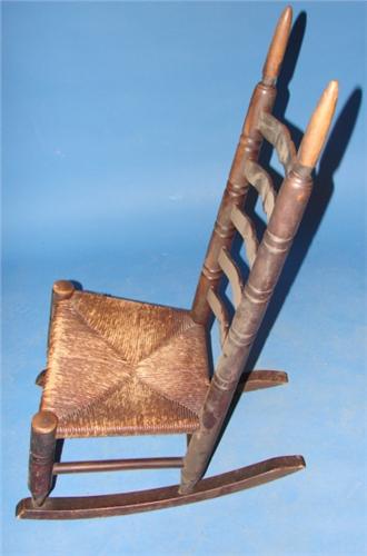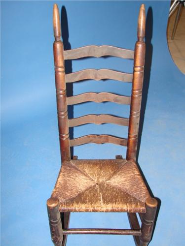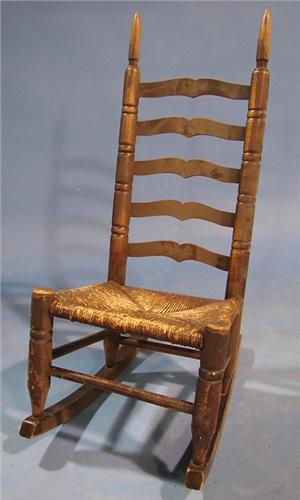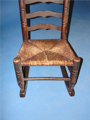 PENNSYLVANIA CHILD’S LADDER BACK ROCKER. Five splat back. Rush bottom seat. Shows signs of wear. 33” H to top of back, 15” W