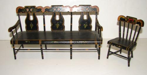 PENNSYLVANIA PAINT DECORATED DOLL FURNITURE. Consists of plank bottom bench and chair. Both are black painted with yellow stenciling and floral decoration. Bench: 5.5" H, 10" L. Chair: 4.75" H