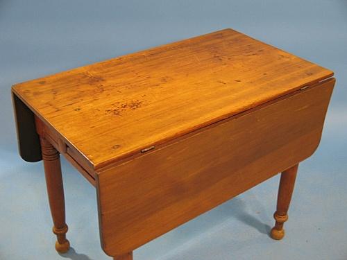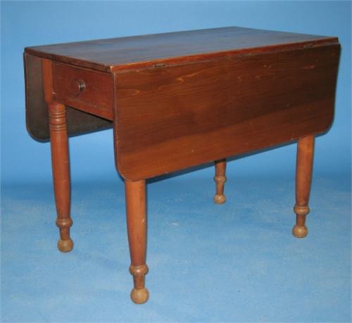 PENNSYLVANIA SOFTWOOD DROP-LEAF FARM TABLE. Turned legs with ball feet. Single dovetailed drawer at side. Shows water damage at top. 29" H, 20" W, 36" D. Each leaf: 12" W