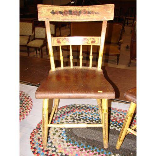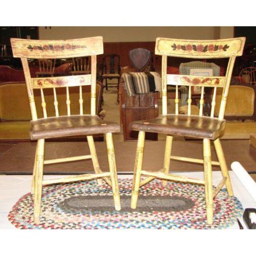 PAIR OF PENNSYLVANIA PAINT DECORATED SIDE CHAIRS. Plank bottoms. Mustard painted with floral decoration at back crest and rail with black stenciling. 32.5” H to top of backs, 16” W