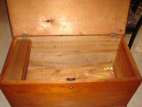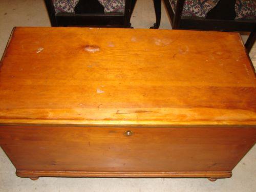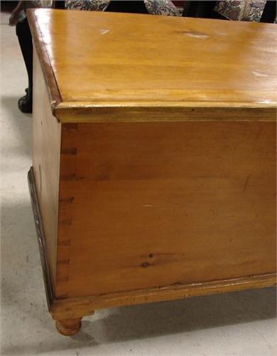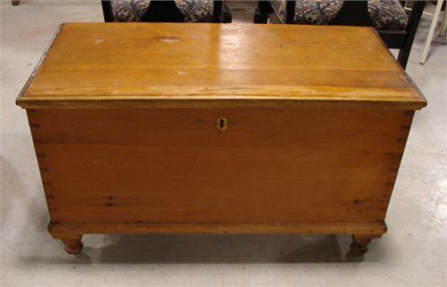 PENNSYLVANIA SOFTWOOD BLANKET CHEST. Dovetailed case. Turned feet. Till in interior. Original hinges & lock. 22” H, 38.25” L, 18.75” W