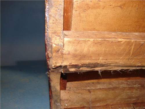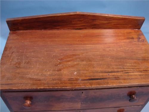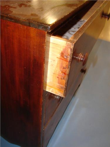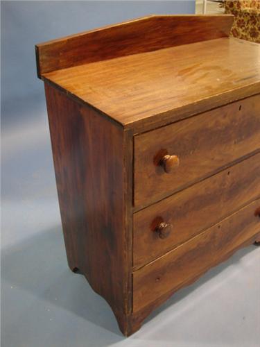 PENNSYLVANIA SOFTWOOD RED GRAIN PAINTED CHEST. Square nailed construction. Has three dovetailed drawers and splash back. Cut-out front and side feet. Has dovetailed stretcher at bottom. Missing pull at bottom drawer. Shows surface scratching. 30” H, 33” W, 17” D