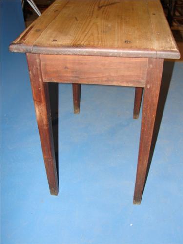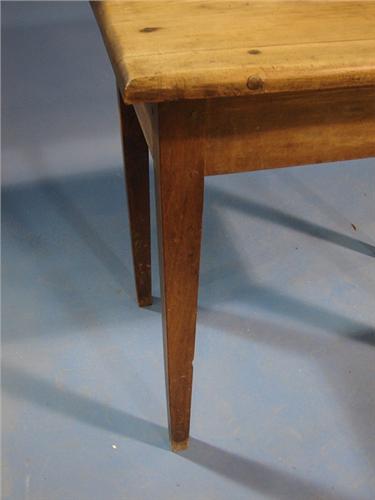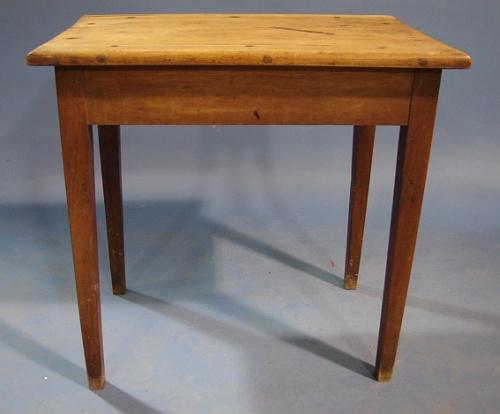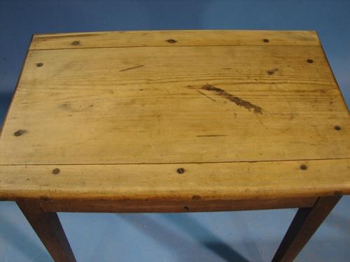 PENNSYLVANIA TABLE. Scrubbed top. Pegged tapered legs. Shows signs of surface wear throughout. 29.5” H, 29.75” L, 19.5” W