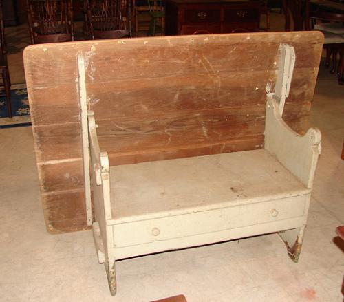 PRIMITIVE OVERPAINTED PENNSYLVANIA BENCH TABLE. Mortis & tendon construction with single dovetailed drawer. 55" L, 41" W