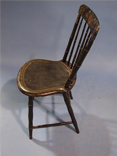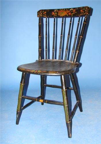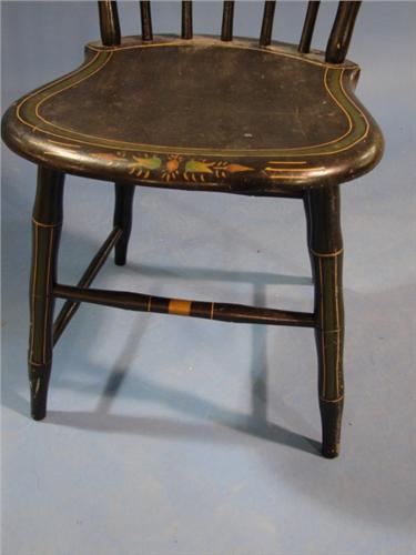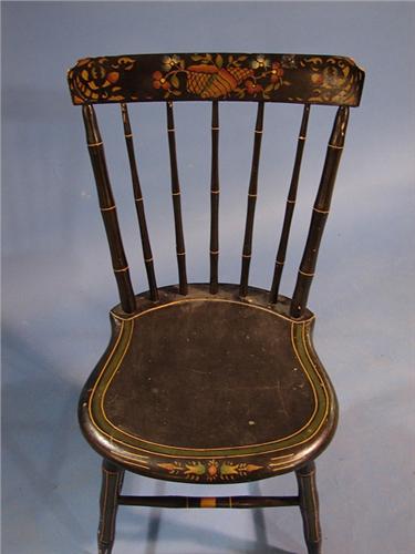 PENNSYLVANIA PAINTED WINDSOR CHAIR. Black paint with yellow stenciling and fruit decoration at top of back rest. Shows a small amount of loss to paint at areas. 33” H to top of back, 14” W