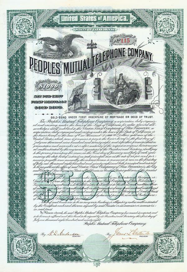 1898, California. $1000 Mortgage bond bearing interest at 6%. Green/Black. Wonderful, multi-vignetted bond depicting a telepone and phone lines, eagle, seated liberty and an early explorer. Coupons at right. Uncancelled and excellent.