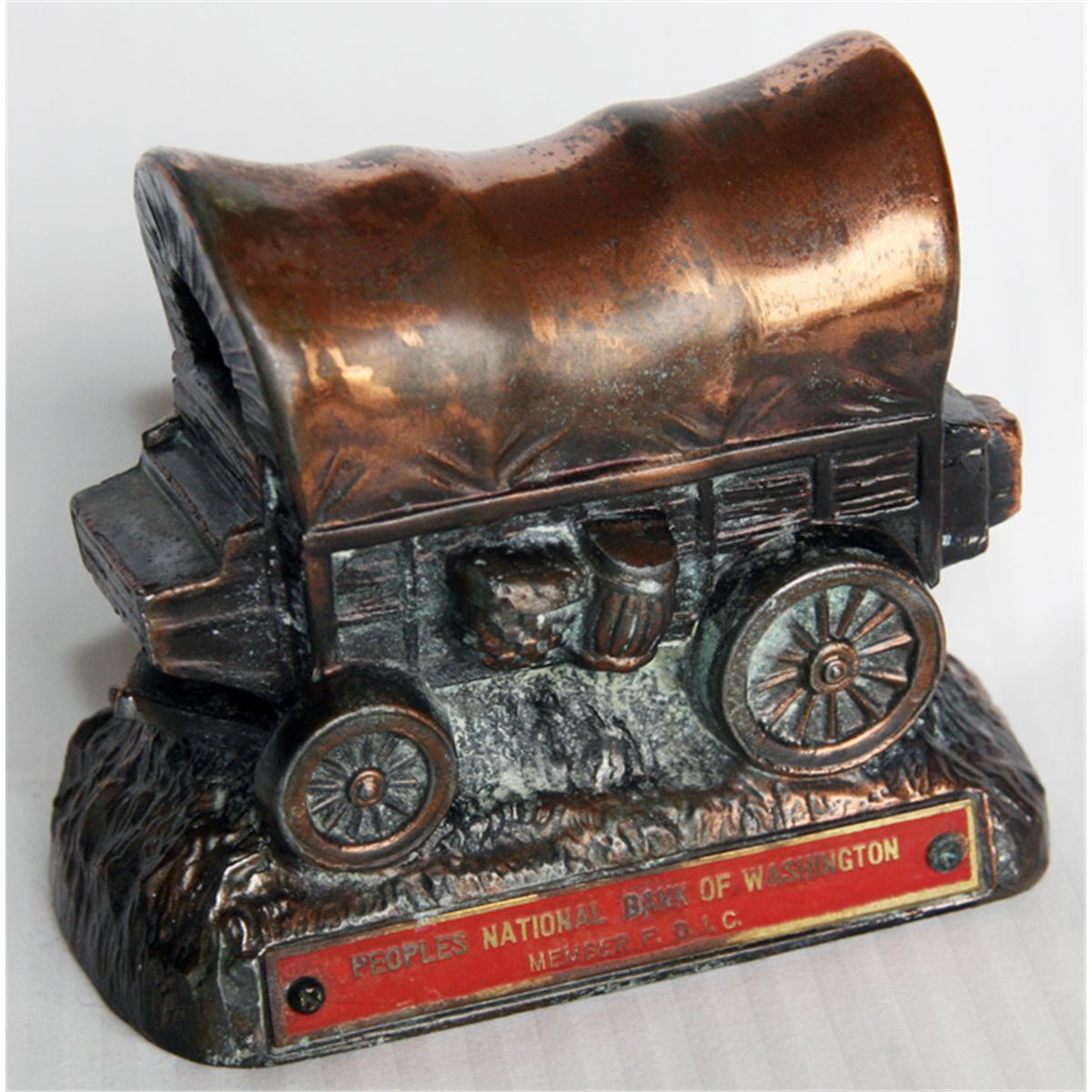 PEOPLES NATIONAL BANK OF WASHINGTON. Bank in the shape of a Conestoga Wagon on a Ground Base. Coin slot at bottom. No handle, key lock, serial number or patent information. 11cm x 10cm x 7cm. A Brass bank, with a burnished finish. Maker-Banthrico, Chicago, USA. EF.