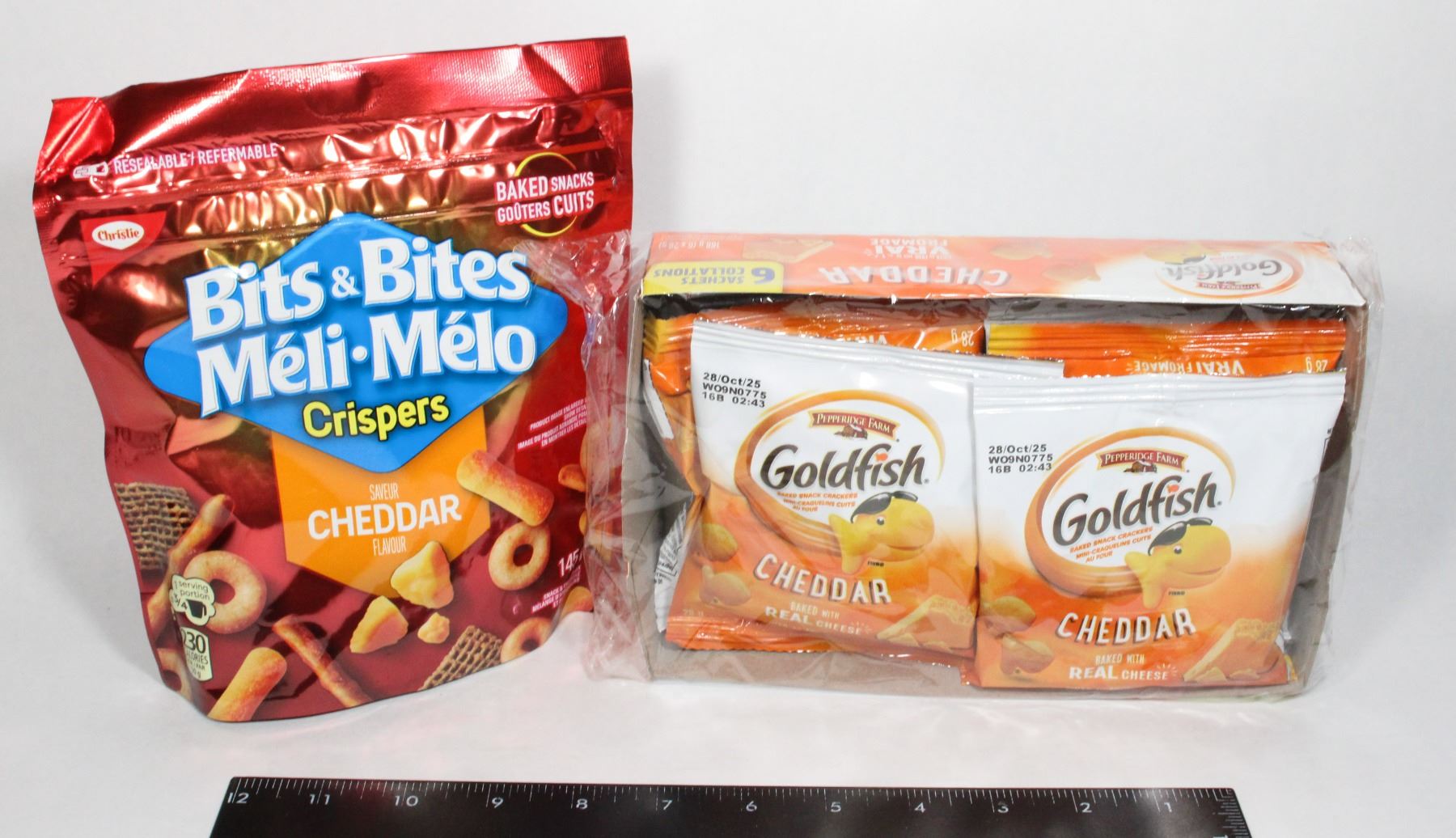 BITES CRISPERS CHEDDAR. THERE ARE 6 PACKS OF 28G GOLDFISH BAGS. BEST BEFORE DATE 28/OCT/25 BITS & BITES 145G BEST BEFORE 2025 AL 06