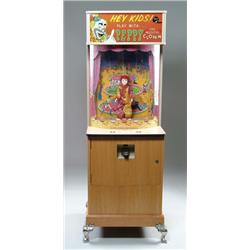 PEPPY THE MUSICAL CLOWN ARCADE COIN-OP. Circa 1950-56, this electrified coin-op with key allows a player to manipulate the clown’s hands and feet via overhead strings. Williams Mfg. Co, Chicago, IL. SIZE: 76” h. CONDITION: Very good, and working. 1-3599 (1,000-2,000)