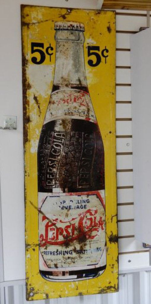 PEPSI- COLA 5 CENT SELF FRAMED SST SIGN ST THOMAS METAL- MADE IN CANADA- 48" X 15 1/2" - DENTING & PAINT LOSS LOCATION: GENERAL STORE