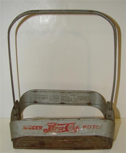 METAL PEPSI-COLA BOTTLE CARRIER. Shows signs of rusting and minor loss to paint. 10.5” H, 8” L