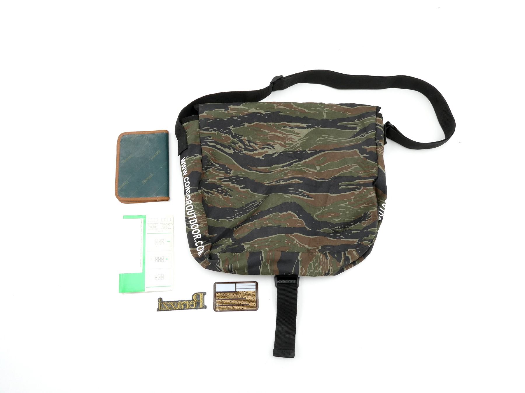 LOT INCLUDES; (1) PERAZZI DOCUMENT HOLDER, OVERALL LENGTH APPROX. 5 7/8" X 4 1/8" & (1) CONDOR SATCHEL, CAMO NYLON CONSTRUCTION, CLIP CLOSURE & CARRY HANDLE, OVERALL LENGTH APPROX. 16" X 15". SEE PHOTOS.
