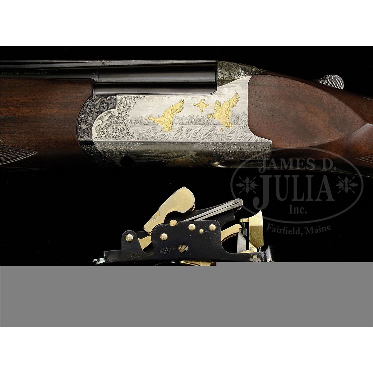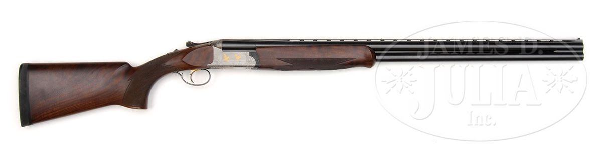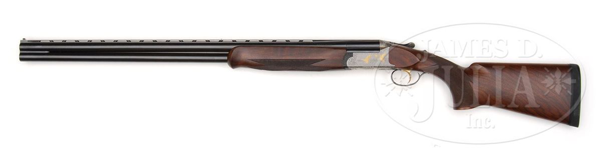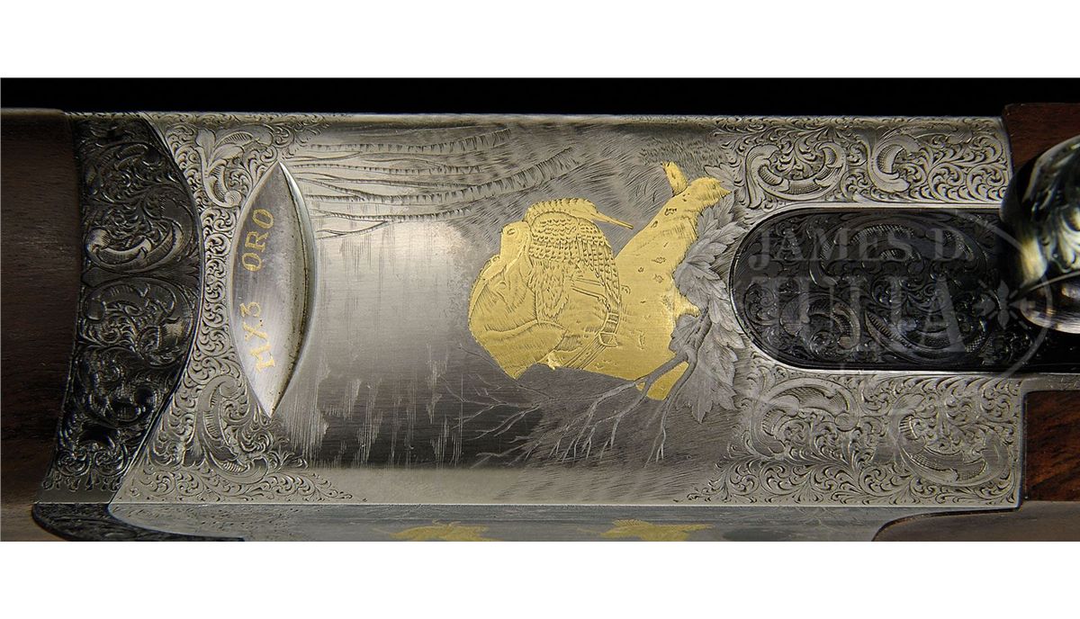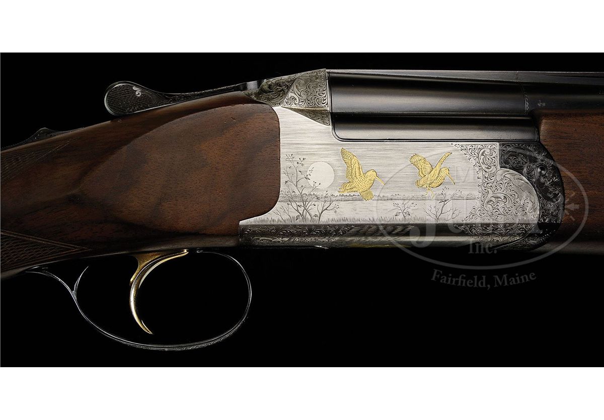 SN 61991. (1982) Cal. 12 ga. 3" Chambers. 29-1/2" Mono-bloc bbls have slightly raised, flat, ventilated rib, and no side ribs, and are marked "Perazzi Brescia" "Made In Italy" "12 ga 2-3/4" chamber" on top left, and "Importer - Perazzi - USA Monrovia - California" on right. Bottom of mono-bloc is stamped with 1982 Italian nitro proofs and SN. Flat sided, coin finished, O/U action with removable trigger and "V" spring firing group, has well cut scroll engraving with large acanthus highlights framing game scenes with principal figures flush inlaid in gold. Finely detailed backgrounds with Bulino engraved inlays of a trio of ducks settling into marsh with fluffing cattails in foreground and wooded background with dramatic sky is on left side of action; right side portrays pair of woodcock with rising moon in background; a pointer retrieving woodcock graces bottom of action with birch tree background. Engravers signature is by firing group mortise. "MX-3 ORO" is gold inlaid in forend iron recess on bottom of action. Blued trigger/ firing group has gold-plated internals, and is engraved "O/U" (firing order). Nicely streaked European walnut full pistol grip point pattern checkered buttstock measures 14-1/4" over black "Decelerator" sporting clays pad. Schnabeled one piece matching forend has Deeley release. Bore diameter: top -.724, bottom -.724. Bore restrictions: Screw chokes. Wall thickness: top -.033, bottom -.032. Drop at heel: 1-15/16", drop at comb: 1-3/4". Weight: 7 lbs. 10 oz, LOP 14-1/4". Green vinyl Perazzi case with brown leather trim is lined in green velvet, and contains brown bags for action and bbls, stock takedown tools, choke wrench, and wallet with hang tags. CONDITION: Excellent. Bbls retain nearly all their orig blue, with some minor marks, mostly from assembly and disassembly. Coin finish of action is bright overall, with a few marks, one fairly heavy on left side near foot of rear duck. Rear of trigger guard is slightly silvered on edges. Stocks retain nearly all their oil finish with a number of minor marks. Bores are excellent. Action is tight. Trigger and ejectors are fine. Case is very fine, with a few minor scuffs. Interior is excellent. 4-87698 MGM314