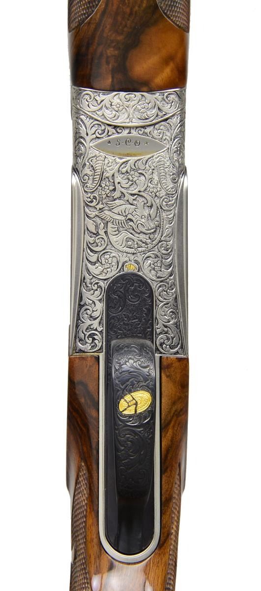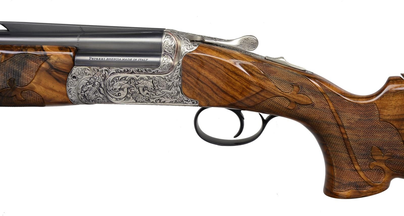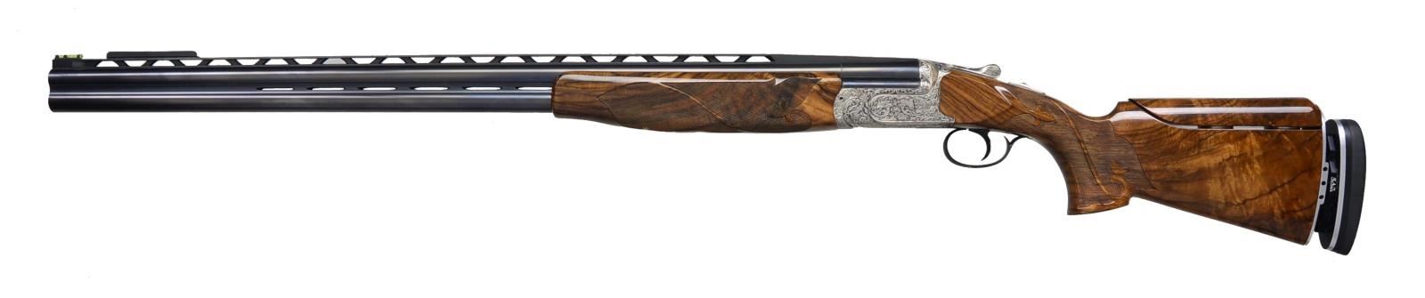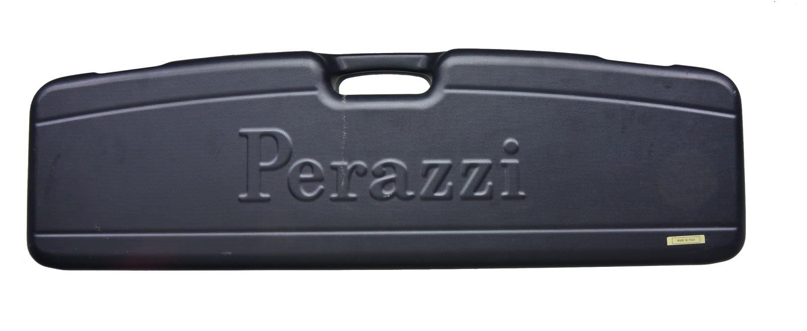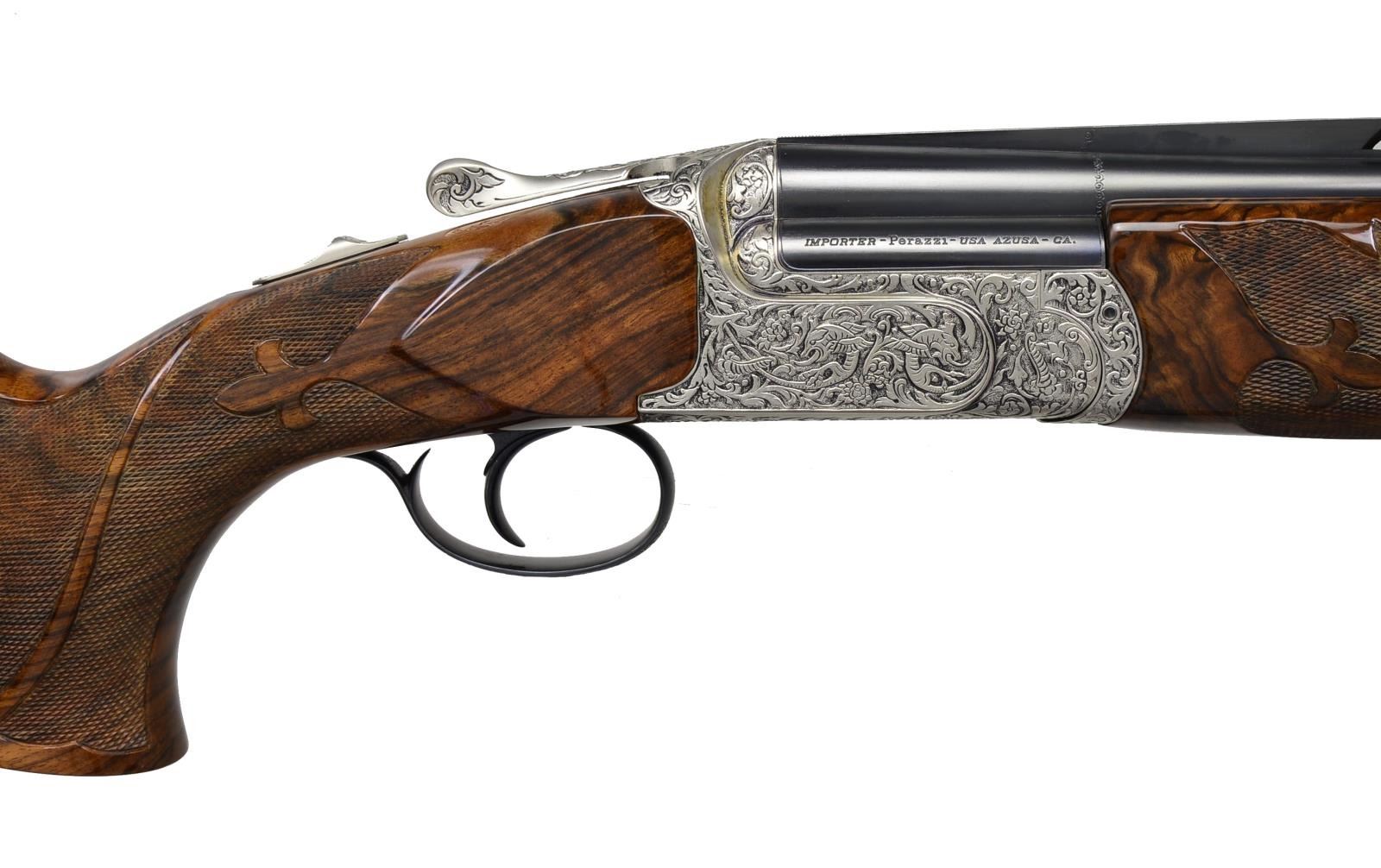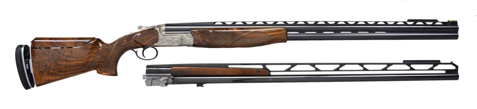 ENGRAVED BY BILL MAINS WITH CARRYING CASE. Cal. 12 Ga., 2 3/4". S# 46047. Two bbl. set. One 33 1/2" for singles trap w/ very high matted ventilated rib. The other 31 1/2" O/U for doubles trap or sporting clays w/ high ventilated top rib & ventilated side ribs. Both fitted w/ 3" steel blinders to keep right handed shooter from using his left eye. Mono-blocs are marked w/ Perazzi importer information & "MADE IN ITALY". Bottoms of mono-blocs are marked w/ Italian nitro proofs for 2 3/4" chambers w/ date code for 2001. Coin finished, low profile, O/U action. Is fitted w/ removable V spring trigger group w/ single non-selective trigger. Action is engraved w/ near full coverage relief engraving in "gargoyle style" w/ scrolling acanthus terminating in the heads of mythological beasts in a stippled background. This striking engraving is by the celebrated Bill Mains whose signature of a buffalo is gold inlaid at front of trigger group mortise on bottom of action. Bottom of action is also marked "S.C.O." in forend iron mortise. Blued trigger guard bow has matching engraving & is gold inlaid w/ a broken clay target. Strikingly figured & nicely marbled flesh toned European walnut pistol grip buttstock is fitted w/ adjustable '"KICK-EEEZ" pad which is mounted on "R.A.D. System" adjuster. Stock also features adjustable comb. Grip, w/ right hand palm swell, is nicely checkered w/ fleur-de-lis & ribbons through pattern. Matching full forend w/ slight schnable has Deeley type release. MEASUREMENTS: BBL - .727. Restriction -.035 (FULL). O/U. BBLS - Bottom .734. Restriction .014 (LIGHT MOD). Top .734 Restriction .022 (MOD). WEIGHT: w/ O/U Bbls. 9 lbs. 6 oz. UNATTACHED ACCESSORIES: black ABS "PERAZZI" embossed case is lined in black corduroy & contains 3 adjustment tools & stock removal tool. CONDITION: very fine, showing very limited use. Most wear is evident on single trap bbls. where high edges of mono-bloc are somewhat silvered. Otherwise there is a scattering of minor marks in stock finish & metal surfaces. Bores are very fine. Mechanically fine. This is a custom gun w/ Bill Mains engraving, not factory production. PROVENANCE: Collection of Alan Bradley Shepherd. (20-4008/MGM). MODERN. $5,000-7,000.