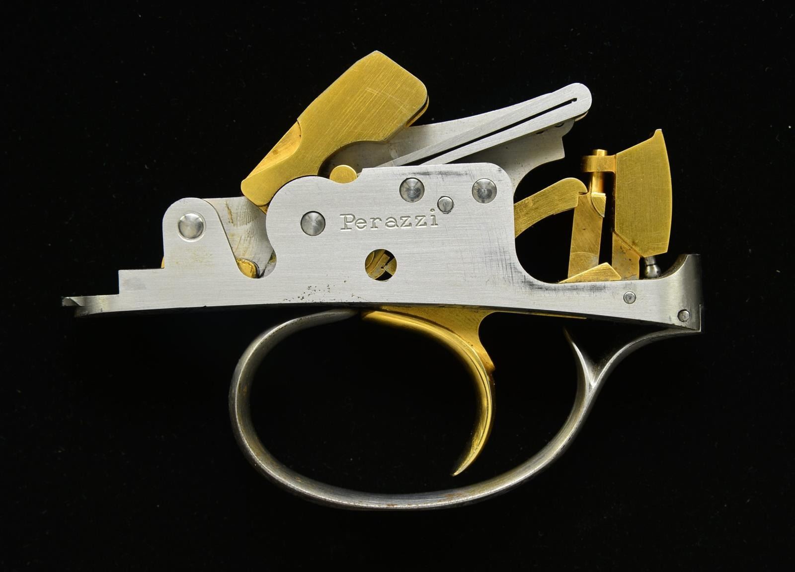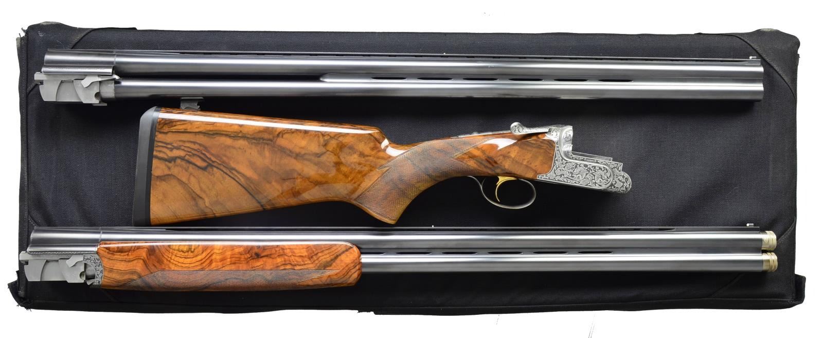 Cal. 12 Ga. S# 125876. Boxlock action with removable gold plated single selective trigger. Ejectors. Full coverage ornamentation featuring dragons surrounded by vine type foliate rose & scroll engraving that continues to forearm iron & trigger guard bow. Forearm & palm swell pistol grip stock of exhibition grade Turkish walnut have gloss finish showing variable tone burl figure with striking dark streaking. LOP: 14 5/8" over solid black Kick-eez pad. DAC: 1 3/8". DAH: 2". Stock is cast off for right handed shooter. Weight with 30" bbls.: 8 lbs., 7 oz. Both bbls. are VR with ported side ribs, interchangeable chokes with white target front sights & steel mid beads. 30" Bbls. are numbered to gun, 29 1/2" bbls. are S# 133062. Includes a 29 1/2" set of Briley Revolution 20 Ga., 28 Ga. & 410 sub gauge tubes with interchangeable chokes. UNATTACHED ACCESSORIES: aluminum Americase holding gun & sub gauge tube set. Case contains extra chokes tubes consisting of 2 tubes each for 20, 28, 410 sub gauge tubes. 5 Extra tubes for each 12 Ga. bbl. along with wrenches & tube assembly tools. Parts kit contains spare firing pins, mainsprings & assembly tools. Also includes instruction manual, Americase registration & instructions, Perazzi thank you letter, Perazzi decal, & cloth bbl. covers. CONDITION: action & both bbls. retain 99% original finish. Stock & forearm have good finish showing scattered small marks. Both bbls. have bright near excellent bores. PROVENANCE: From the Frederic W. Thrane Collection. (20-2477/DS). MODERN. $12,000-18,000.