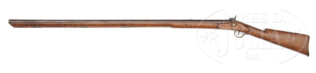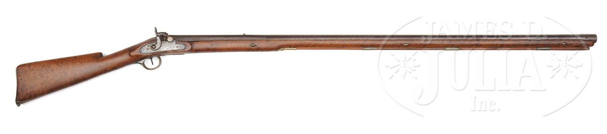 NSN. 43-1/2" oct to rnd .54 Cal smooth bore, unmarked thick-walled bbl. Engraved percussion unmarked lock. Early brass trigger guard engraved with bow with acorn finial. Cherry stock. CONDITION: Small crack in stock in front of lock. Rear trigger guard tang broken and repaired. Large crack at toe of butt. Mechanically functioning. 4-49662