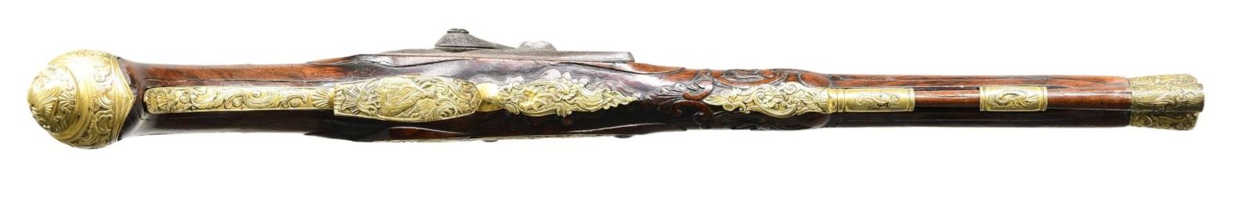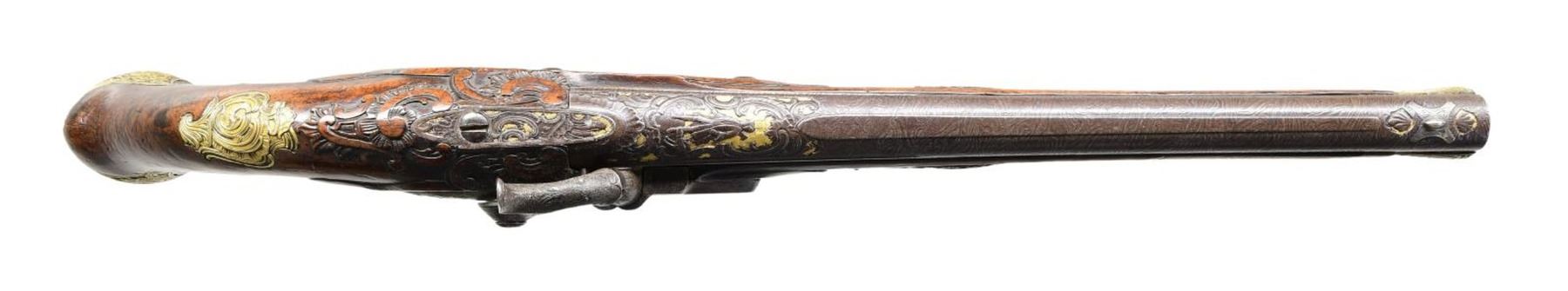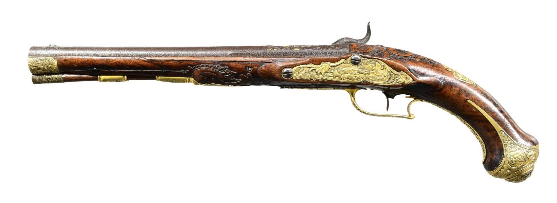 UNSIGNED EUROPEAN PISTOL. Cal. 56. NSN. The 11 1/4" tapered round etched damascus barrel with top rib has breech section deeply relief engraved with scene of hunter and dog within flowing open scroll. Background is gold damascened. A newly fitted bolster replaces touch hole. Lock with round bodied arched plate is fitted with newer round bodied serpentine hammer engraved with scrolls. Remainder of plate has original relief engraved scene of running stag and hound in similar style to top of barrel. Fruitwood stock with knob grip extends to muzzle with brass cap and is pinned to barrel. Raised mouldings are around lock, fancy solid sideplate and ramrod channel. Raised carved scrolls and acanthus surround barrel tang and thimble. This work is very well done. Pistol is mounted with relief cast gilded brass and these mounts consist of grip cap with side spurs, trigger guard with foliate finial, scroll engraved crestplate, large sideplate and ramrod pipe and matching thimble which hold walnut ramrod with cast brass tip. Relief cast decoration of these fine mounts include a ladies head on grip cap with sporting scenes on sides, trigger guard bow is engraved with huntress and hound. Hound and dead game are on sideplate. Remainder shows scrolling acanthus with some shell highlights. CONDITION: good. Barrel and lock are gray brown patina, barrel with dramatic figure highlighted by light cleaning. Stock retains most of its original finish with hand wear at grip. Mounts retain most of their gilded finish. Bore is pitted. Lock is operable. A very attractive Rococo period pistol. (01-24385/MGM). ANTIQUE. $1,500-2,500.