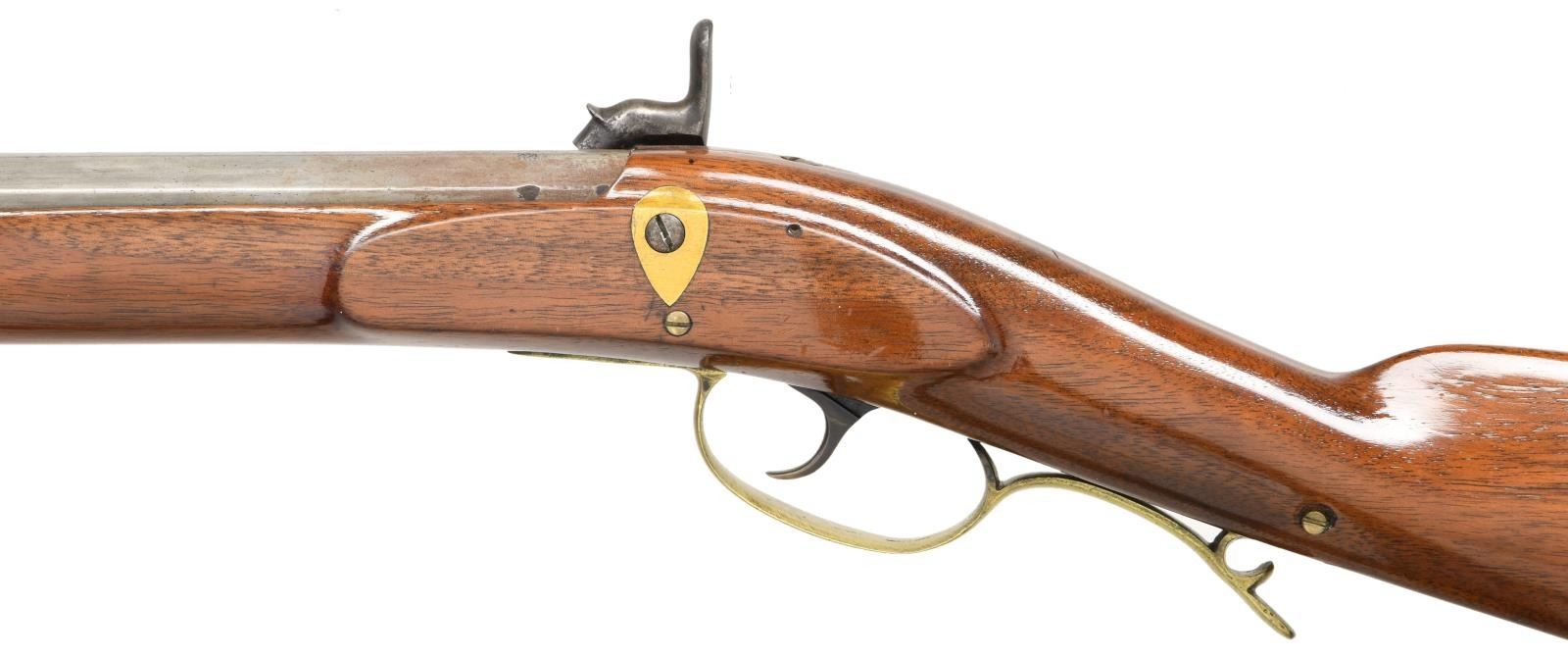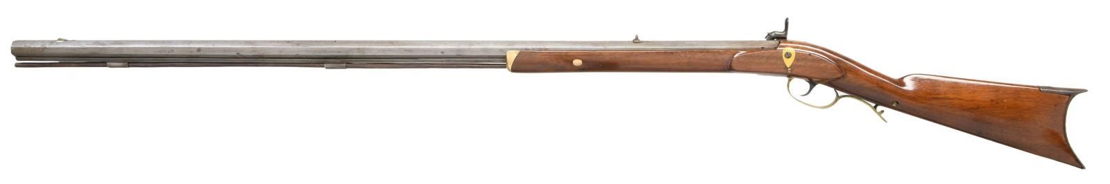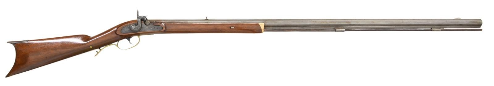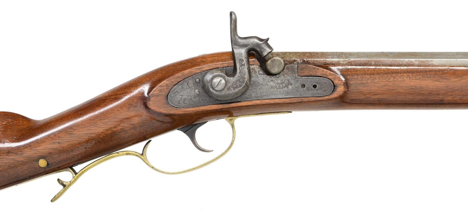 Cal. 40. NSN. Bbl. 37" rifled oct. Blade front sight. Fixed rear sight. Lock has dog scene engraving at rear & faint "BER" maker marking at front possibly for Barber. Walnut stock w/ brass furniture. Brass reinforcement in wrist & odd "U.S." marking on bottom of butt. Wooden ramrod. CONDITION: stock appears lightly sanded w/ added varnish, a well executed wrist repair behind upper tang & scattered handling marks. Brass parts appear cleaned w/ scattered oxidation & dings. Lock & hammer are a dull gray patina & maybe replacements w/ scattered oxidation & light pitting. Bbl. is a light gray patina w/ some light pitting & scattered oxidation. Pitted bore. (01-23686/MJC). ANTIQUE. $100-300.
