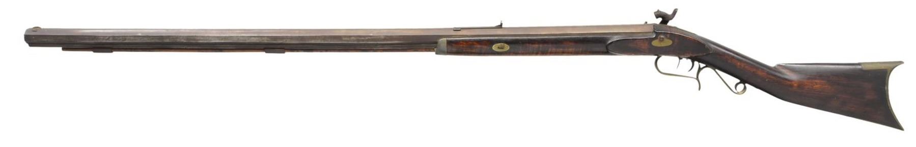 Cal. 40. NSN. Bbl. 38" oct. Round brass blade front sight. Elevator-adjustable semi-buckhorn rear sight. Bbl. has cursive "EL" markings. Gun otherwise appears unmarked. Double-set triggers that are not functioning properly. Hammer gets hung up when the trigger is pulled and will require attention to fix. Half-length walnut stock with brass patchbox, finger-curl trigger guard, and buttplate. The hardwood ramrod is secured by two iron pipes. CONDITION: stock appears sanded with added varnish, some chips, a couple cracks, dings, and handling wear. Brass parts have a dull yellow patina with scattered oxidation and some dings. The balance of metal is a gray patina with scattered pitting and oxidation. Oxidized bore with scattered pitting. (01-24415/MJC). ANTIQUE. $400-600.