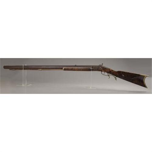 <B>PERCUSSION HALF-STOCK STYLE PLAINS RIFLE.</B></I> Barrel marked I. or J. Nagle on top flat and "Remington" at breach. "Conestoga Rifle Works" marked lock plate. Circa 1860. 36" barrel of approximately .40 caliber. Forend cap of pewter with brass trigger-guard, butt plate, toe plate and ramrod ferrels. Functioning double-set triggers. Raised cheek piece with nicely grained wood stock. <BR><BR><B>Condition:</B></I> Stock broken & repaired at wrist. 3¼" piece of wood replaced in front of lock plate. Metal surfaces have a nice overall patina.<BR><BR><b>Shipping:</b> Bats, Clubs, Sticks, Swords, Rif (<a target="_blank" href="http://www.heritageauctions.com/common/shipping.php">view shipping information</a>)
