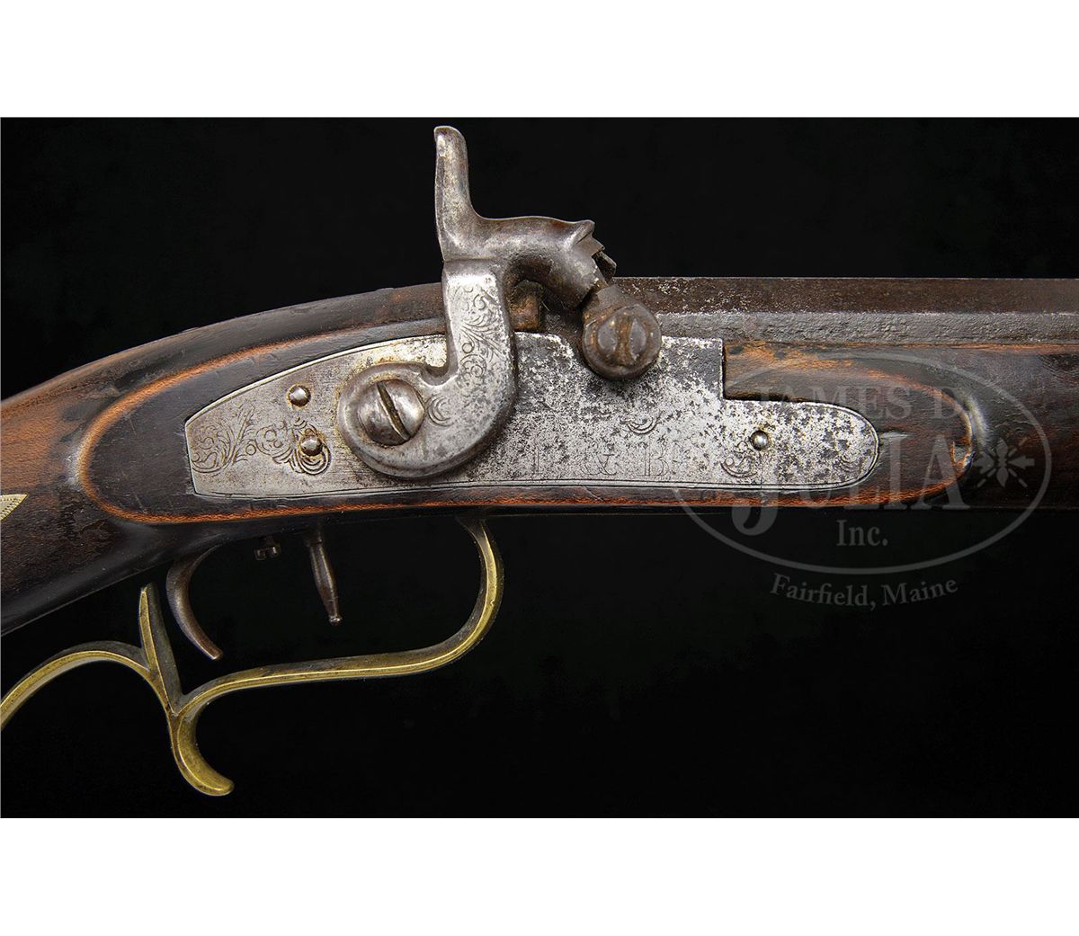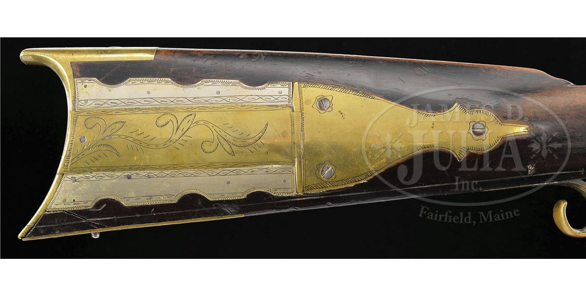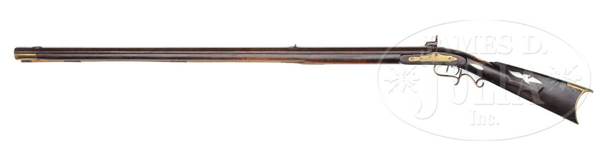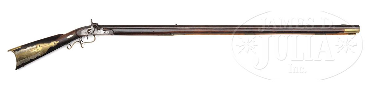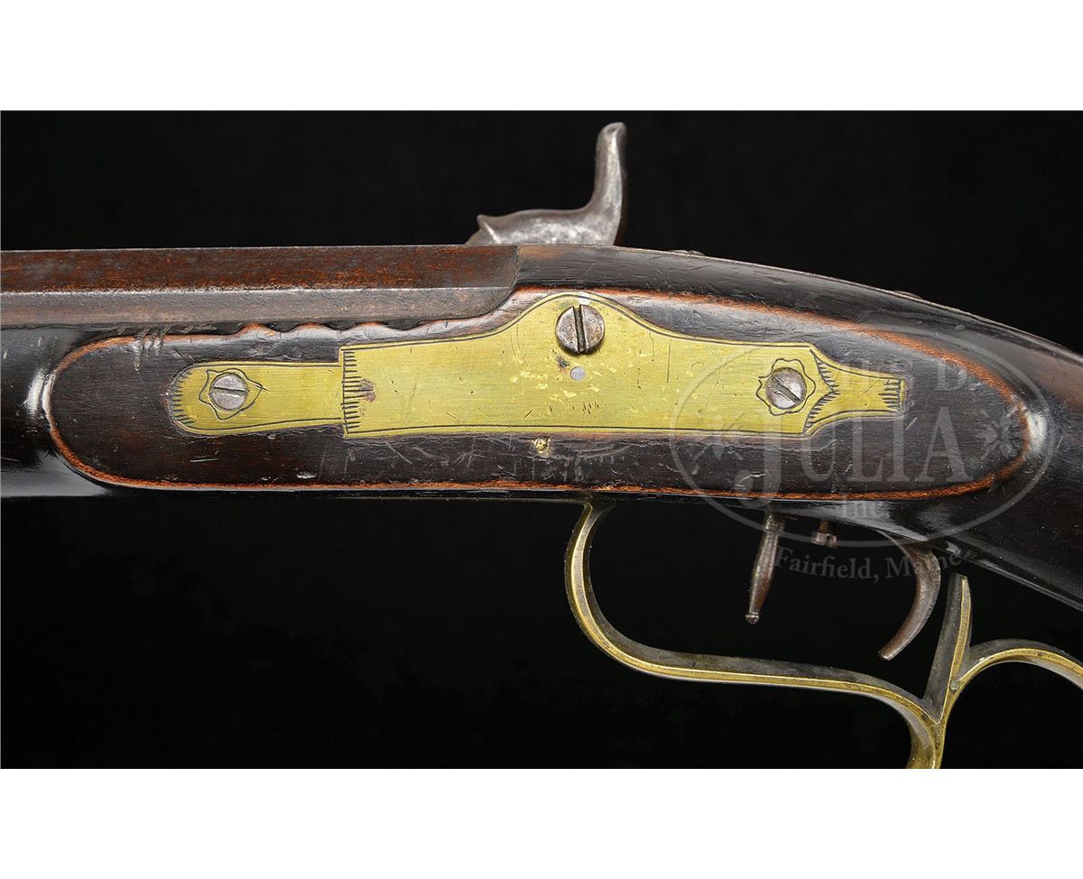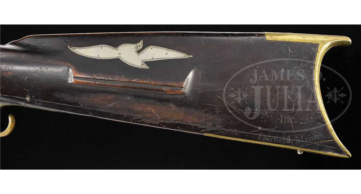 NSN. 41" full oct rifled 45 Cal. bbl stamped "W. M. Lloyd". Rifle has a four piece Huntington style brass engraved patchbox with two silver sideplates. Rifle has four silver inlays one being a flying bird inlay on the cheek. Brass sideplate is fastened by two wood screws on the extreme ends. Stock is finished dark but is curly maple. Rifle has double set triggers and a fancy figured trigger guard. Late percussion lock plate seems to be marked "I & B" but is almost illegible. CONDITION: Very Good overall. Rifle is in solid and original condition throughout. Lock needs adjustment. 4-49141 RG73