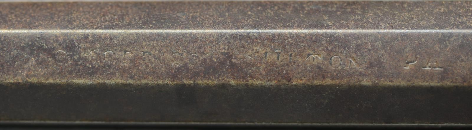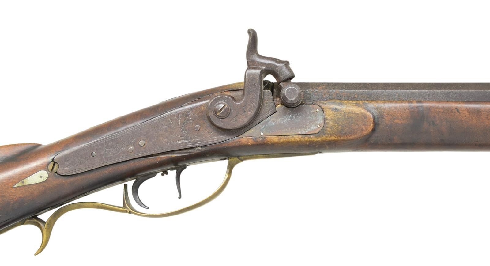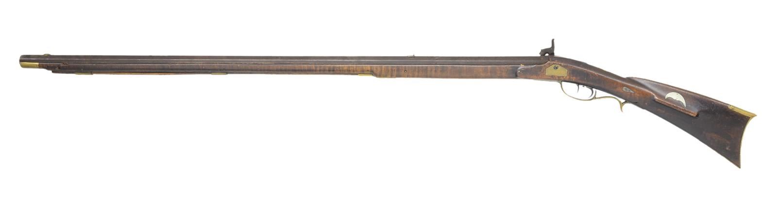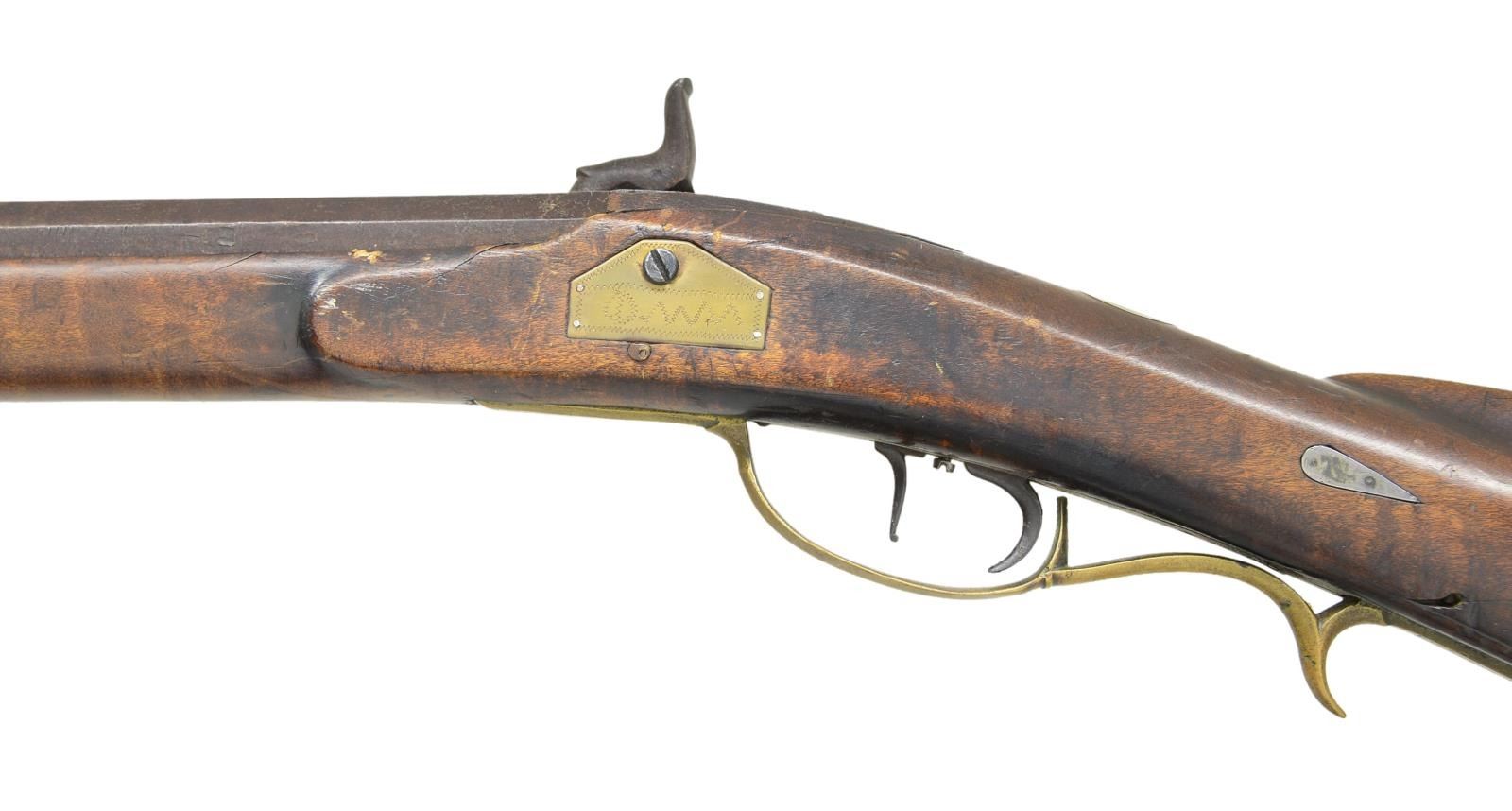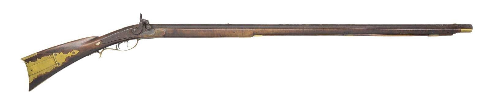 Cal. 50 rifled bore. NSN. Bbl. 37" full oct., stamped “S MORRISON MILTON PA”. Overall length 52". Has a 4 piece patchbox & 4 silver inlays. Percussion back action lock marked “G. GOLCHER”, a Philadelphia lock maker & has dbl. set triggers. Samuel Morrison worked in Milton PA about 1826 to 1843 & like Beerstecher made some Kentucky’s w/ superposed loads. CONDITION: 2x3/4" repair plate under the percussion nipple & sm. brass sideplate on left hand side appears to be added. PROVENANCE: Collection of Dr. John Persing. (01-19537/RG). ANTIQUE. $1,000-2,000.