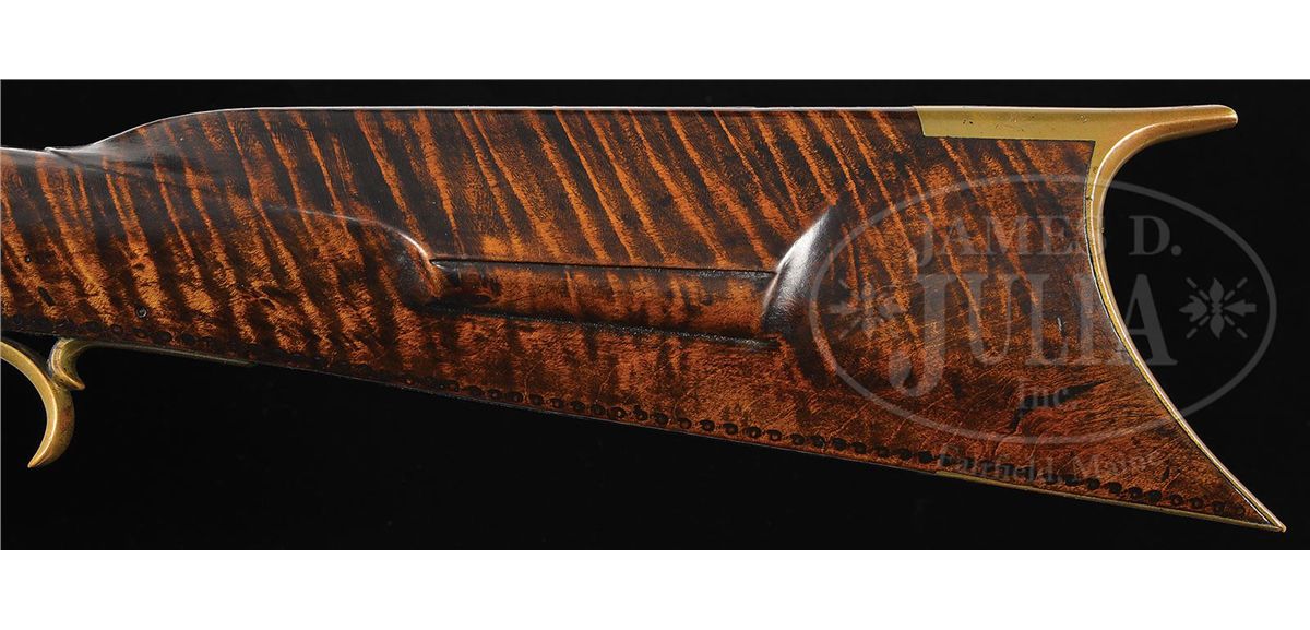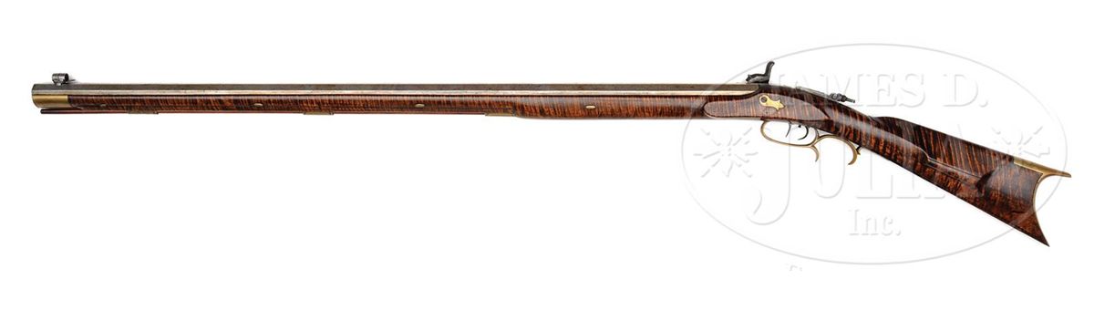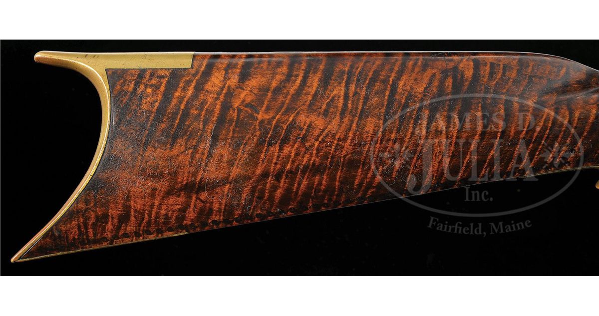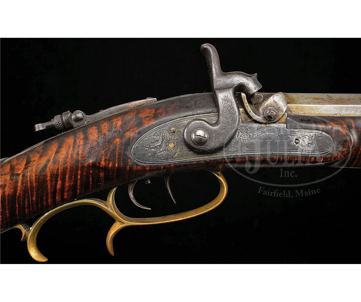 NSN. 38" full oct 45 Cal. rifled bbl stamped "E. L. Pancost". This heavy target rifle has a finely figured curly maple stock. Percussion lock was made by Joseph Golcher of Philadelphia. Rifle has double set triggers and is equipped with modern target sights and was used recently as a shooter. CONDITION: Rifle is solid and clean throughout and is in working condition. 4-49146 RG75