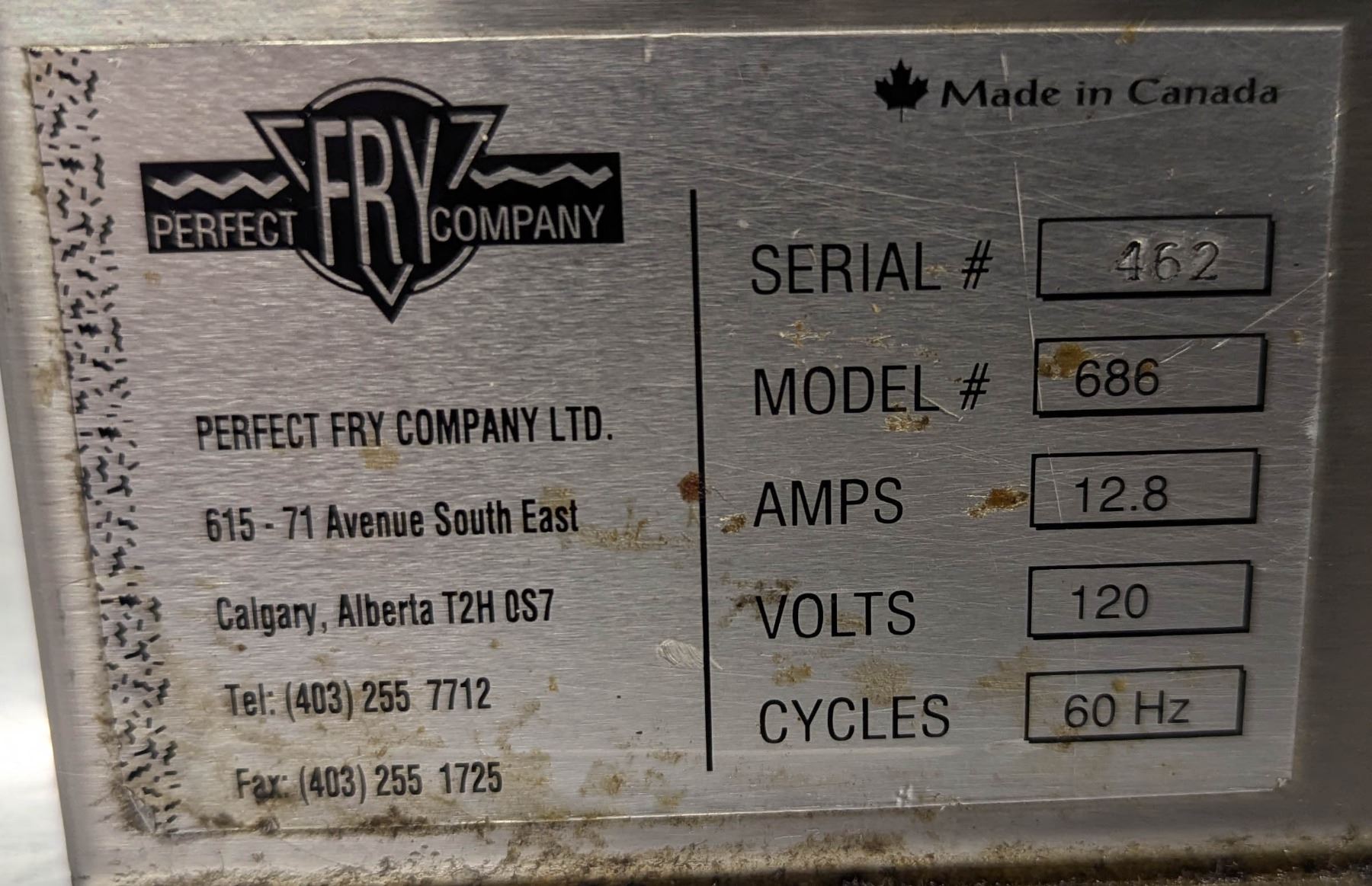 PERFECT FRY COMPANY, MODEL 686, AMPS 12.8, VOLTS 120, CYCLES 60HZ
