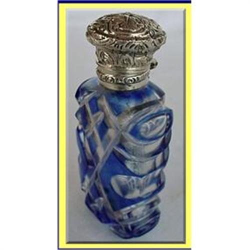 Victorian perfume bottle in blue cut cased glass with repousse sterling silver hinged lid.